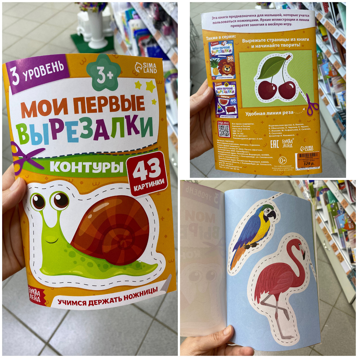 Всем привет. Меня зовут Наталья. Я очень рада видеть вас на своём канале. Сегодня мы с вами прогуляемся по магазину Галамарт, который находится по адресу: город Йошкар-Ола, Ленинский проспект, дом 6. В этот раз я покажу самые разнообразные новинки. Так что устраивайтесь поудобнее. Желаю всем приятного времяпровождения. Серия книг "Мои первые вырезалки, контуры" стоимостью 129 рублей. Сделано в России. С помощью этой книги вы научите детей пользоваться ножницами. Яркие иллюстрации и линии превратят занятия в весёлую игру. Серия книг "Книжка-вырезалка. Бумажные зверята. Кубики." стоимостью 129 рублей. Сделано в России. В этой книге 8 фигурок разных животных. Ребёнку достаточно вырезать выкройки и склеить их, чтобы собрать свой собственный зоопарк. Серия книг "Книга-вырезалка. Объёмные букеты" стоимостью 229 рублей. Сделано в России. С помощью этой книги ваш ребёнок сможет создать неповторимые композиции для любимых людей: мамы, бабушки или подруги. Обложка для студенческого билета стоимо