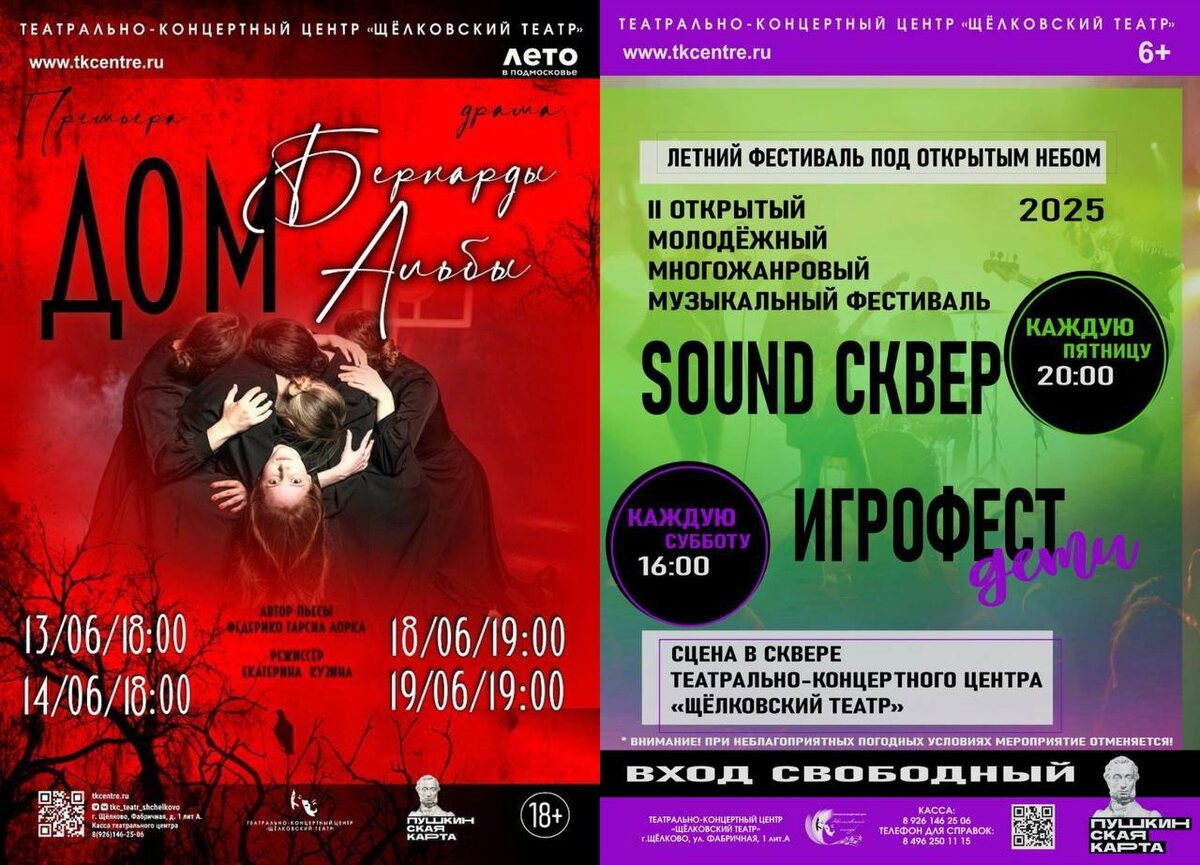 Успейте посетить: Щёлковский театр закрывает театральный сезон 🎭 ✨ 18 и 19 июня в 19:00 – спектакль «Дом Бернарды Альбы» (18+). История о том, на что готова пойти женщина ради любви, свободы и права жить так, как ей хочется. После похорон своего второго мужа Бернарда объявляет дочерям восьмилетний траур, во время которого у них не будет доступа за пределы дома. Она даже не предполагала, какой трагедией это может обернуться. ✨ 20 июня в 20:00 и 21 июня в 16:00 – еженедельный музыкальный фестиваль «Sound Сквер» в Театральном сквере (6+). Обратите внимание, что при неблагоприятных погодных условиях мероприятия отменяются. 🎫 Билеты на tkcentre.ru и в кассе театра. 📍 г. Щёлково, ул. Фабричная, 1А. #культуращёлково #летовподмосковье