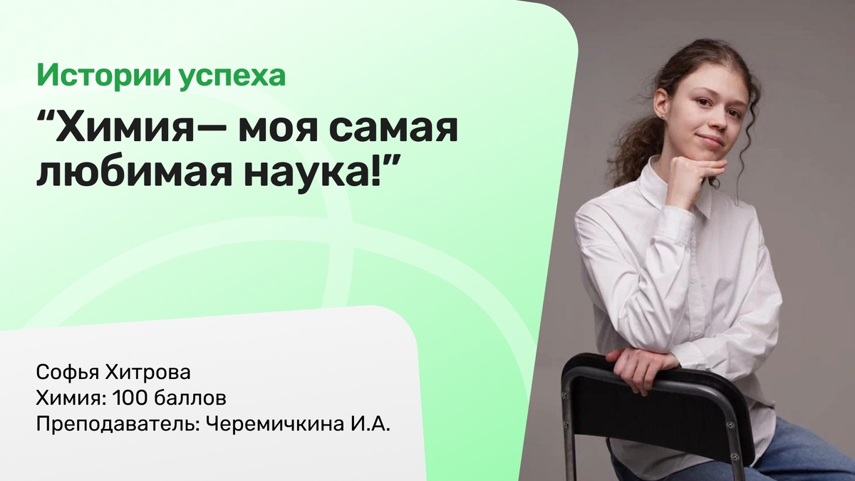 Мы рады представить вам интервью еще с одной звездочкой ЕГЭбурга, стобалльницей из группы Ирины Александровны Черемичкиной! Софья Хитрова блистала своими знаниями на экзамене по химии и в итоге забрала все баллы! Ирина Александровна Черемичкина рассказывала нам, что вы невероятно увлечены химией, погружены в нее. Как появился такой интерес? Да, химия — моя самая любимая наука! Я, наверное, вообще ничто не люблю так, как химию. Мне привили любовь к ней ещё в 8 классе, и с тех пор я ей прямо горю. Занимаюсь на курсах и сама, люблю читать много дополнительной химической литературы, постоянно хочется узнавать что-то новое и нестандартное. А вы не пробовали себя в олимпиадах по этому предмету? Пробовала, в 11 классе стала призёром двух олимпиад. Вы занимались у нас год или больше? В 9 классе готовилась у вас к ОГЭ по химии. А потом пришла уже в выпускном классе на три предмета. Многие недооценивают подготовку к ОГЭ, считая, что экзамен легкий. Как вам кажется, важно ли готовиться к нему