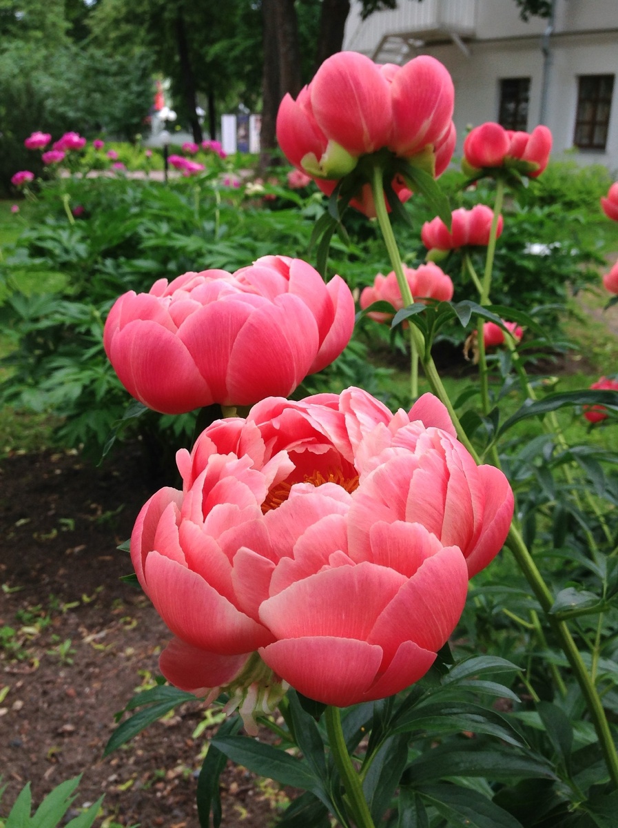 В парке Музея зарубежного искусства цветут ито-гибриды – пионы, созданные путем скрещивания древовидных и травянистых пионов. Впервые такие растения были получены в 1948 году японским селекционером Тоичи Ито. Одной из целей скрещиывния было получение цветка с желтыми лепестками. Сейчас ито-гибриды имеют широкий диапазон форм и окраски – от различных тонов желтого до красного, от чистого белого до фиолетового, очень часто с контрастным окрашиванием в основании лепестков.