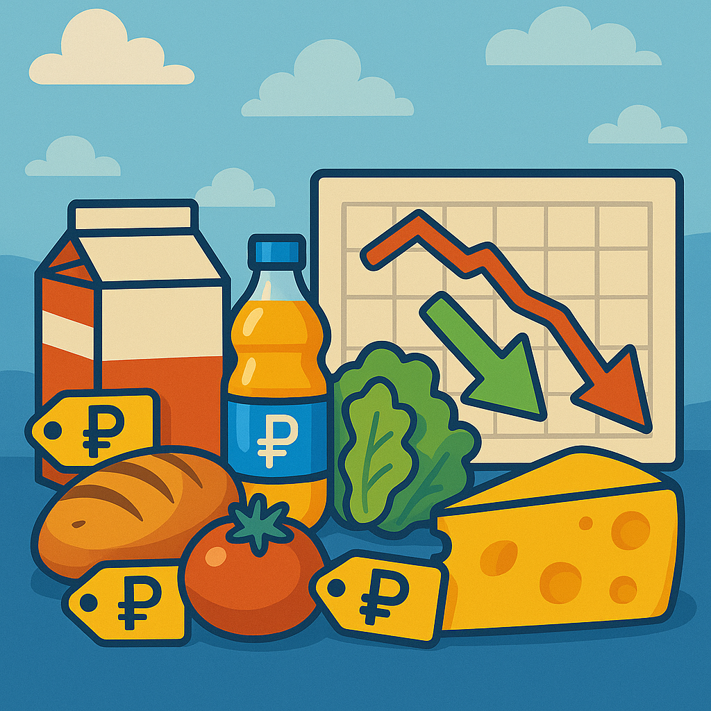 Первая неделя июня 2025 года принесла положительные новости для российской экономики: темпы инфляции заметно снизились. Согласно свежему обзору Минэкономразвития, недельная инфляция с 3 по 9 июня составила всего 0,03%, что ниже предыдущего значения в 0,05%. Годовые темпы инфляции также пошли на спад: с 9,85% до 9,71%12. Пищевые продукты: сезонное снижение цен В сегменте продовольствия зафиксировано общее снижение цен на 0,01%. Особенно заметно подешевели плодоовощная продукция — минус 0,6%. В лидерах по удешевлению оказались капуста (-5,4%), помидоры (-2,6%), лук (-2,1%), огурцы (-1,3%) и бананы (-1,1%). Однако не все овощи следовали этому тренду: морковь и свёкла подорожали на 2,8%, а яблоки — на 1,4%. Непродовольственные товары: рост цен остаётся умеренным В непродовольственном секторе цены выросли на 0,02%. Незначительный рост зафиксирован на электропылесосы (+0,4%), детские спортивные костюмы (+0,2%), мужские майки и футболки, автомобили иностранных марок, сигареты с фильтром и сма