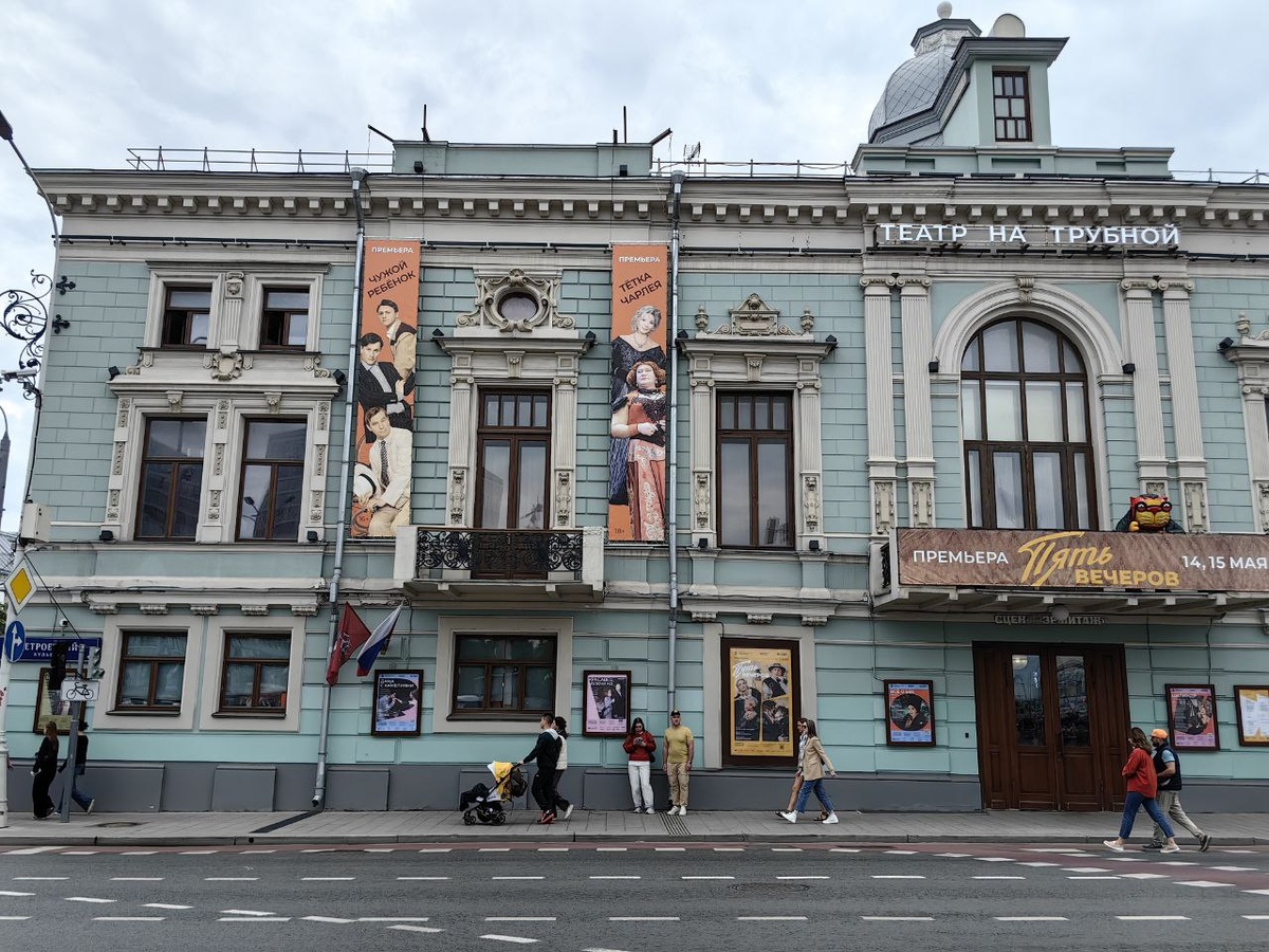 Трубная площадь Москвы. Название площадь получила от заключения реки Неглинки в трубу. Река затапливала здешние места. Сейчас на Трубной площади восстановили здание театра современной пьесы, фото 1. Очень красивый вид на Рождественский бульвар, он на высоком берегу бывшей реки Неглинки. А внизу на площади- уродливое здание из стекла - бывший дом пропаганды, под ним - надувной шар, это для фестиваля "Лето в городе", место проведения мероприятий, концертов, мы мимо прошли. Далее , после театра , два известных ресторана " Белое солнце пустыни " и " Узбекистан" с входом через средне-азиатский портал со скульптурой верблюда внутри и питьевым фонтанчиком. Очень красивая дверь с узорами. Ресторан " Узбекистан" в этом месте с советских времен. Через дорогу от ресторана помпезное и богато украшенное здание бывшей владелицы Сандуновских бань, которые находятся за зданием. #летовгороде #садыицветы #кудапойтивмоскве #праздничныелокациимосквы #детямивзрослым #цветывмоскве