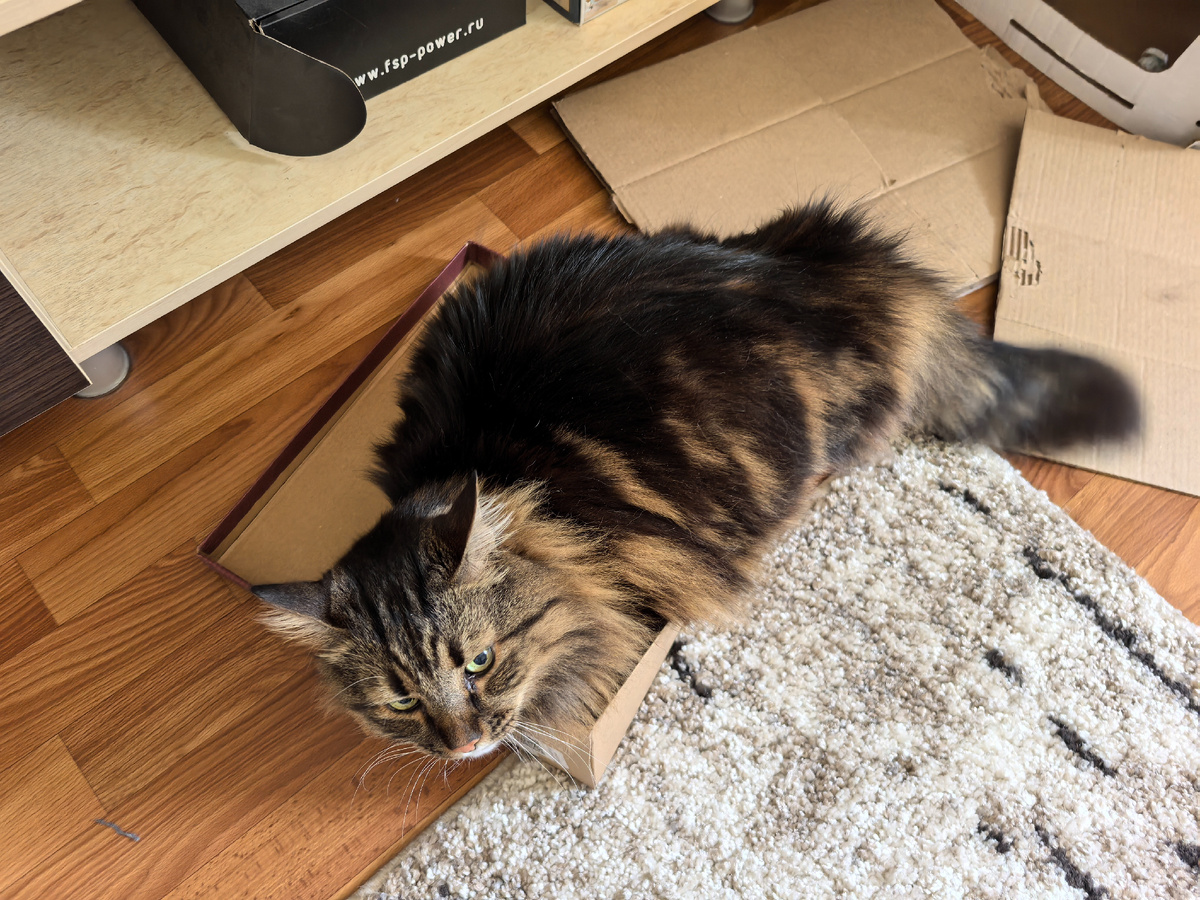 Всем привет! С вами Кузя Кусалочкин! И сегодня я вам расскажу о том, что котики влезут в любую коробку, про мошенников и нашего нового жильца. Утро началось как обычно. Правда, в этот раз хозяйка позволила себе поспать немного дольше (всего минут на 40). И я сразу с хозяйкой встал, получил свой паштетик. Мне так нравится, что сейчас выходные и хозяин дома. Мы с ним играем. Играли, играли, и у меня получилось влезть в эту маленькую коробку: Возможно, ракурс не показывает, но я в неё прям поместился, все лапки в коробке. Я вам вчера немного пожаловался, что мне неправильно насчитали число дочитываний одной статьи. По моим подсчётам, должно было быть около 20, а насчитали 12. Знаете, я не постеснялся написать в поддержку. И стал наблюдать за новой статьёй. Заметил, что 5 человек прочитали, а в статистике 4 дочитывания и 5 лайков. Но спихнуть на то, что кто-то просто так лайк поставил, не получится. Это все те, кому интересно, кто действительно читает. В поддержке от этой статьи отмах