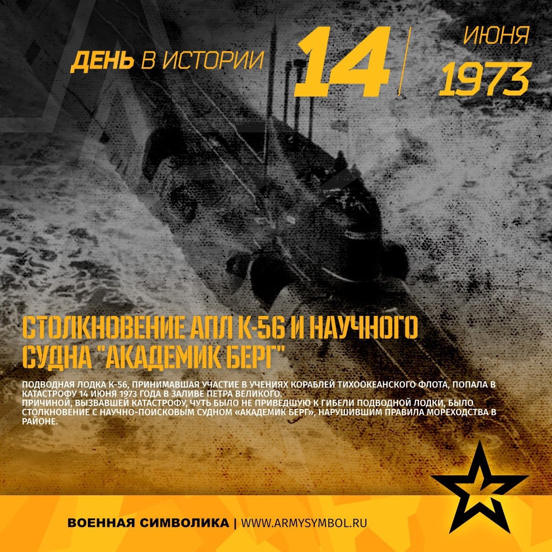Столкновение АПЛ К-56 и научного судна "Академик Берг» в 1973 Подводная лодка К-56, принимавшая участие в учениях кораблей Тихоокеанского флота, попала в катастрофу 14 июня 1973 года в заливе Петра Великого. Причиной, вызвавшей катастрофу, чуть было не приведшую к гибели подводной лодки, было столкновение с научно-поисковым судном «Академик Берг», нарушившим правила мореходства в районе. Исполняющий обязанности командира корабля Леонид Хоменко принял решение выбросить лодку на берег сразу же после удара, благо лодка находилась недалеко от него. Это было судьбоносное решение, спасшее жизнь большинству экипажа. Но до берега еще нужно было дойти. #ПамятныеДатыВоеннойИсторииОтечества #ДеньВИстории #ГодЗащитникаОтечества #80ЛетВеликойПобеды Источник: https://vk.com/wall-60767131_30891 Подпишитесь на наши группы ВКонтакте и в Одноклассниках - читайте, смотрите и комментируйте! Источник