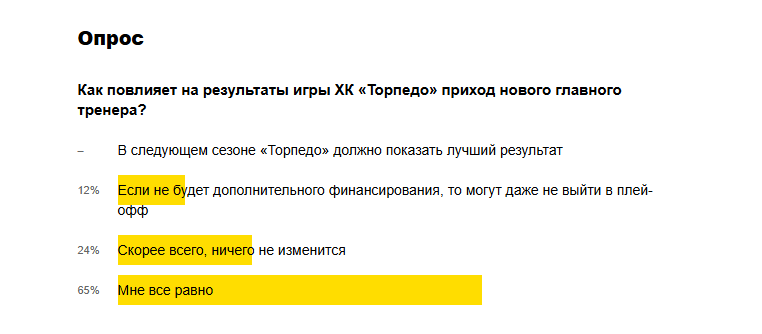 Читатели ИА «Время Н» высказали свое мнение. Почти четверть читателей (24%), принявших участие в опросе на сайте ИА «Время Н», считают, что приход нового главного тренера не повлияет на результаты игры хоккейного клуба «Торпедо». Оптимистов, кто верит, что в следующем сезоне «Торпедо» покажет лучший результат, среди опрошенных не нашлось. 12% респондентов полагают, что торпедовцы даже не выйдут в плей-офф, если не будет дополнительного финансирования команды. Большинство же выразило безразличную позицию к игре нижегородского клуба. Ранее ХК «Торпедо» сформировал новый тренерский состав и объявил об изменениях в команде. Новым главным тренером ХК «Торпедо» станет Алексей Исаков, при котором ХК «Торпедо-Горький» выиграл Кубок чемпиона. Помощниками главного тренера будут Дмитрий Гоголев, работавший в минувшем сезоне главным тренером молодежной «Чайки», и Игорь Уланов, ранее входивший в тренерский штаб основной команды. Дмитрий Владимирович будет отвечать за работу с нападающими, а Игорь С