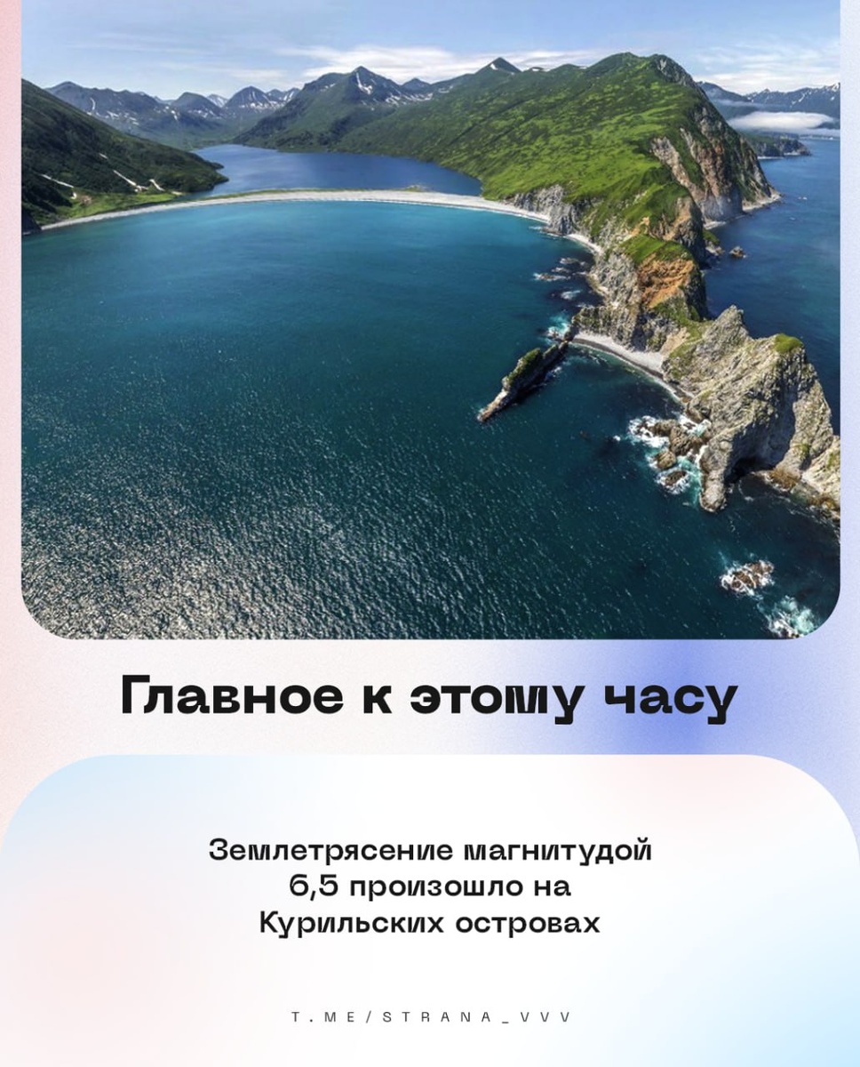 🇷🇺🇷🇺🇷🇺🇷🇺🇷🇺🇷🇺 на утро 14 июня: 🔹Землетрясение магнитудой 6,5 произошло на Курильских островах. 🔹Мошенники могут похищать деньги у участников спецоперации, предлагая помочь найти попавших в плен, говорится в материалах МВД России. 🔹Автобус с 13 вахтовиками перевернулся в Хабаровском крае, шесть пассажиров доставлены в медучреждение, сообщает Госавтоинспекция региона. 🔹Рост производства в обрабатывающей промышленности на 40% по сравнению с показателями 2022 года ожидается к 2030-му, рассказал первый вице-премьер Мантуров. 🔹Силы ПВО за ночь сбили 66 украинских БПЛА над регионами России, сообщили в МО РФ. UPD: правительство России утвердило порядок назначения единовременных выплат в размере до 6 млн рублей ополченцам ДНР и ЛНР, получившим инвалидность, сообщили в кабмине. 🇷🇺 В Стране. Подписаться