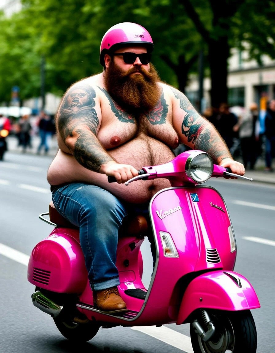 Доброе утро! A photo of an extremely obese, very hairy and tattoo-covered man in jeans, sunglasses, riding on the back of a pink Vespa scooter wearing a helmet around Berlin. The scooter is too small for him, so he hangs off the handlebars. With a very important and serious look. He has a big bulging belly and chest hair and a beard. Photo meme #neuroart #нейроарт #ai #ии #нейросеть #картинки #искусственныйинтеллект #цифровоеискусство #digitalart #арт #art #prompt #промпт #подсказка