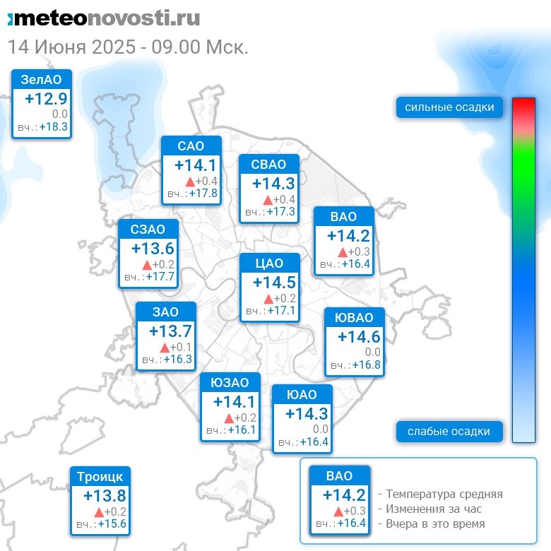 В 9:00 в Москве было от +12.8°C до +14.9°C, средняя температура +14.2°C #погода #Москва #лето #температура #14июня #суббота