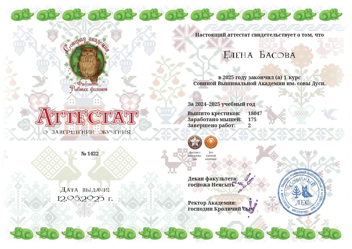 Приветствую, друзья! Обучение в Совиной Академии завершилось в конце мая, подведены итоги учебного года (мой факультет победил😎), и вот, вчера мне выдали Аттестат 🙌 В этой статье я хочу подвести свои личные итоги и поделиться впечатлениями. Если хочется посмотреть только фото процесса, листайте статью вниз😉 Причиной вступления в этот совместник стало желание продвинуть и завершить "зависший" процесс от Совиного леса - "Звездный дракон". До начала Академии было вышито 16% Поначалу я бодро вышивала и сдавала каждый отчёт (еженедельно). Это видно даже по моим статьям на канале 😉 До Нового года вышила дополнительно две маленьких игрушки ёлочки для перехода на следующий уровень игры (уровень фильдеперсовости). С этими же ёлочками приняла участие в конкурсе Академии - нужно было просто выложить фото в альбом ВК, победитель определялся рандомно, я им не стала, к сожалению. И это была моя единственная доп активность за год 😄 От чата-болталки я отписалась довольно быстро (слииишком мно