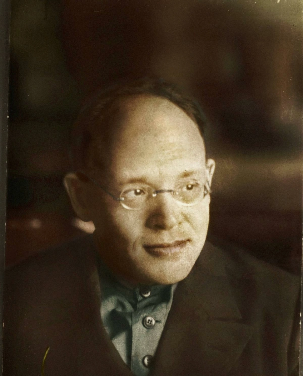 «Он проживал в доме „Эльпитрабкоммуна“ вместе с женой, занимая одну комнату в коммунальной квартире, и у него действительно, если мне не изменяет память, были синие глаза на худощавом, хорошо вылепленном, но не всегда хорошо выбритом лице уже не слишком молодого блондина с независимо‑ироническим, а временами даже и надменным выражением, в котором тем не менее присутствовало нечто актерское, а временами даже и лисье» (В. Катаев. «АМВ»).