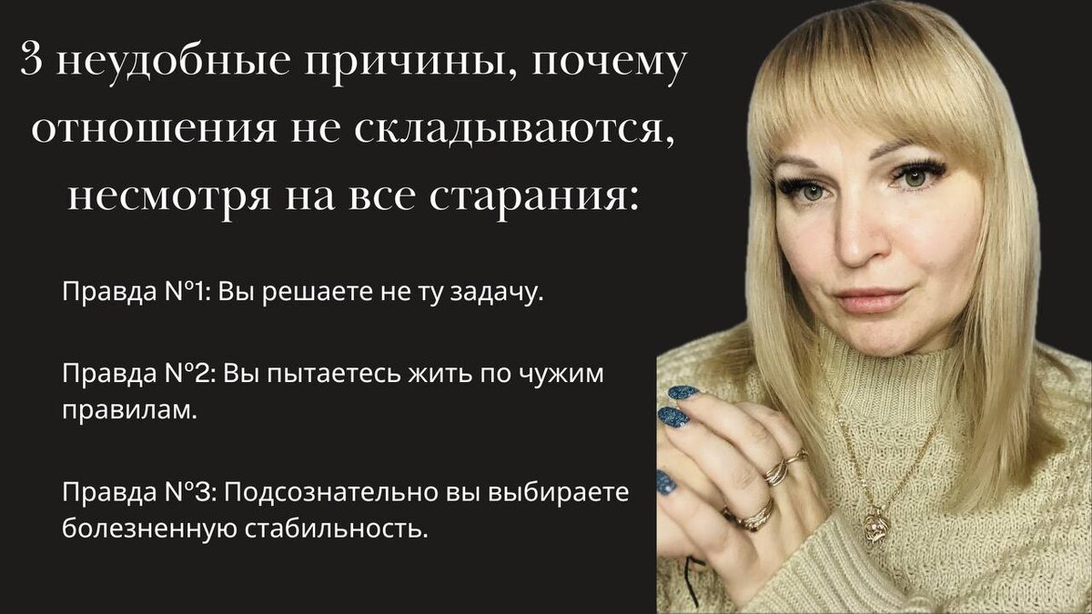 3 неудобные причины, почему отношения не складываются, несмотря на все старания Я читаю книги, прохожу марафоны, работаю над собой — и всё равно какие-то проблемы… Почему не получается? Иногда мы стоим у самого порога любви: читаем, слушаем, ищем ответы — а отношения не складываются. Я частенько такое встречаю — особенно у женщин, которые делают всё, что «положено». Только не то, что действительно работает. Проблема не в мотивации. И не в том, что вы «недоработали». Правда №1: Вы решаете не ту задачу. Очень часто женщины приходят с вопросом: Почему он себя так ведёт? Что со мной не так? И начинают искать ответ на уровне «женских практик», внешнего поведения, «как понравиться» и «как быть мягкой». А настоящая причина зарыта глубже — в энергии самой пары, в том, как течёт энергия между вами, что вы друг в друге активируете. Это как пытаться чинить розетку, не понимая, что проблема в щитке. Вы прикладываете усилия, а напряжение так и не появляется. Невозможно наладить отношения