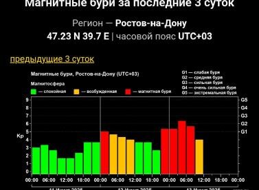 В Ростовской области этой ночью произошла магнитная буря, о чем сообщила Лаборатория солнечной астрономии Института космических исследований РАН. Магнитосфера находится на среднем уровне G2 более 11 часов. Причины этого явления пока не ясны, так как оно не было предусмотрено прогнозами. Научная гипотеза связывает бурю с воздействием крупной корональной дыры на Солнце, находящейся в южном полушарии. Ученые предполагают, что Земля взаимодействует с плотным веществом на границе этой дыры. Магнитные бури могут продолжаться над Ростовской областью еще три дня.