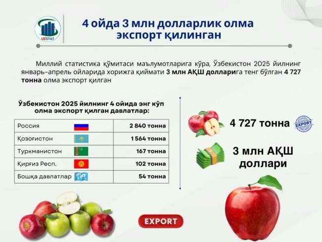 По данным Нацкомитета за первые четыре месяца 2025 года Узбекистану удалось экспортировать 4 727 тонн яблок. Общая стоимость экспортных поставок составила 3 миллиона долларов США.