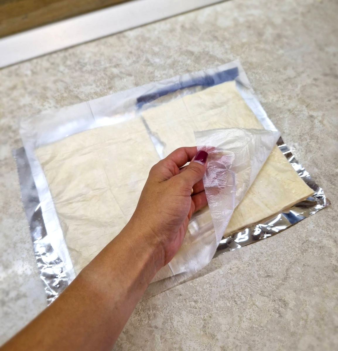 Обожаю выпечку из слоеного теста за минимум возни и быстроту приготовления. Слоеное тесто всегда выручает, когда времени в обрез, а хочется порадовать себя и близких чем-то вкусным и интересным. Вчера у нас был небольшой девочковый "шабаш" в честь пятницы 13-го. Стол ломился от закусок, салатов и прочих деликатесов: рулетики из ветчины с финиками, рулетики из баклажана с сыром, бутерброды "Цезарь" и многое другое. Ну а главным блюдом вечера стал отрывной пирог из слоеного теста с сыром камамбер. Любители сочетания хрустящего воздушного теста с горячим, нежным расплавленным сыром точно оценят! Он идеально подходит для вечеринок и посиделок в большой компании, его удобно подавать на общем блюде и есть, отрывая порционные кусочки и обмакивая их в расплавленном сыре. Для начала размораживаем тесто при комнатной температуре до мягкого состояния. Я разрезаю упаковку, раскладываю на ней пласты теста и накрываю целофановым пакетиком, чтобы тесто не пересыхало. Затем раскатываем тесто в тонки