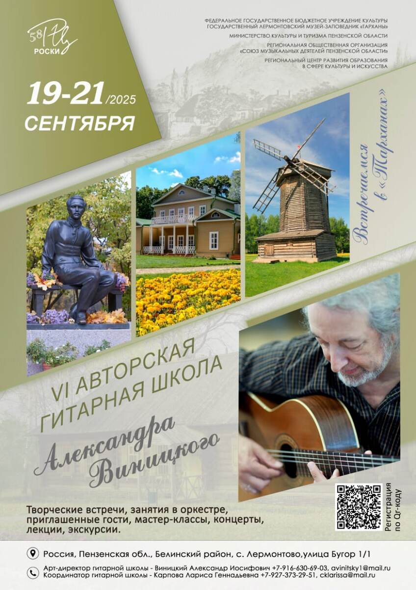 Друзья! Приглашаем вас в VI авторскую гитарную школу Александра Виницкого в Тарханах 19-21 сентября 2025 г. в Лермонтовский государственный музей-заповедник! Вас ждет насыщенная, разнообразная программа: Интерактивные занятия по ритмической и мелодической импровизации, лекции, мастер классы А. Виницкого, концерт «Секреты импровизации» Александра Виницкого, репетиции и концерт гитарного оркестра, концерт Дмитрия Шаповалова, который представит сольную джазовую программу на классической гитаре "Звездная пыль", концерт Назара Малышева "Диалоги с музыкой", вас также ждут экскурсии в музее-заповеднике. ПРОГРАММА школы, форма ЗАЯВКИ и УСЛОВИЯ ДЛЯ УЧАСТНИКОВ в прикрепленных документах. ВСЕ ВОПРОСЫ ВЫ МОЖЕТЕ ЗАДАТЬ АЛЕКСАНДРУ ИОСИФОВИЧУ ВИНИЦКОМУ: avinitsky1@mail.ru