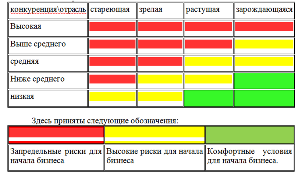 Поскольку предприятия ещё нет, то здесь нужно дать анализ отрасли, к которой предприятие будет относится. Всю необходимую информацию по отрасли в выбираемом регионе можно взять из статистических справочников и специальных отраслевых журналов. Потенциальные возможности вновь создаваемого предприятия поможет оценить «матрица жизненных циклов». Известно, что производство товаров (и отрасли, основанные на их классификации,) появляется на свет, развивается, стареет и умирает, вслед за развитием потребностей. Поэтому отрасли можно условно разделить на зарождающиеся, растущие, зрелые и стареющие. Примером умершей отрасли можно назвать транспортное коневодство. Его заменило автомобилестроение, и сейчас оно находится в зрелой стадии развития. Кроме этого, в каждой отрасли существует свой уровень конкуренции. В специальной литературе всегда можно найти экспертные оценки на эту тему. Если условно разделить конкуренцию на низкую, ниже среднего, среднюю, выше среднего и высокую, то на основе данных о зрелости отрасли и степени конкуренции в ней можно составить мартицу жизненных циклов, которая позволит оценить место Вашего будущего бизнеса в отрасли. Вот как выглядит эта матрица: