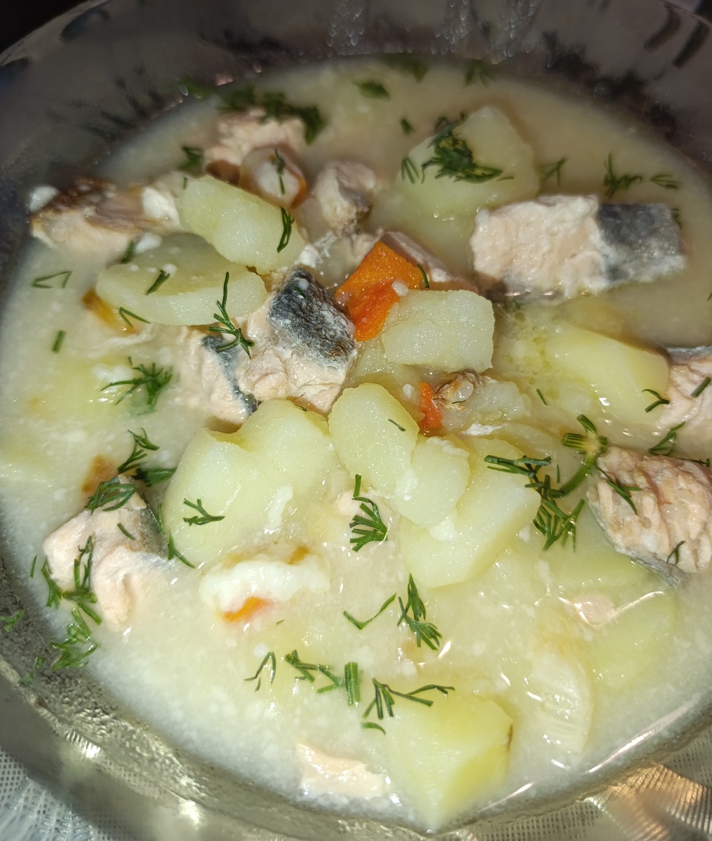Для этого супчика нам потребуется картофель, рыба (у меня горбуша), по 1 шт моркови и лука, муки 3 ст л (но это зависит от объема Вашей кастрюли, я пишу для объема 4 л) и сливки 500 гр. Итак, картофель, очищаем, моем и нарезаем немного крупнее, чем на картофельный суп. Ставим варить. После закипания солим. Варим 15 минут. Рыбу (у меня весом 1 кг) моем, филируем и нарезаем. Добавляем к картофелю и варим 20 минут после закипания. Лук очищаем, моем, нарезаем, пассируем. Добавляем нарезанную кубиками морковь. Сразу подготовьте муку и сливки, так как далее нужно делать все быстро. Добавляем муку. Быстро размешиваем и не переставая мешать постепенно вливаем сливки. Прогреваем. Добавляем эту массу в суп. Перемешиваем. Доводим до кипения. Если требуется добавляем еще соли, а также мелко нарезанную зелень. Приятного аппетита!!!!! Рецепт приготовления рыбного супчика из консервов с картофелем и крупой Вы можете посмотреть здесь.