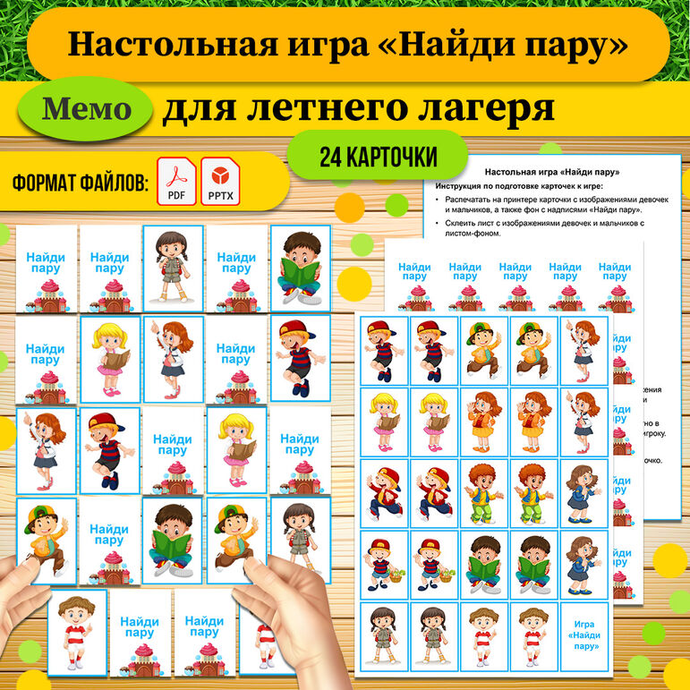 Игра для летнего лагеря «Найди пару» (настольная игра Мемо «Летний лагерь») – это отличный способ занять детей. Она развивает память, внимание и наблюдательность, а также способствует общению и взаимодействию в команде. Материал состоит из трёх листов формата А4: 1 лист занимают карточки с изображениями мальчиков и девочек, 2 лист занимает фон (рубашки карточек), 3 лист инструкция по подготовке к игре и правила игры. Материал доступен для скачивания в PDF-формате и PPTX-формате (редактируемый).