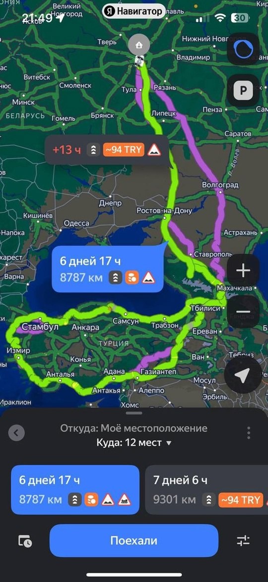 ✏️ Дальняк.рф™: Едем двумя мото - Гусь и Африка, из Москвы в Турцию, через Кавказ, Грузию и обратно. Предполагаемый пробег 10000 км. По времени - около 3 недель. На магистралях держим крейсер 130-140. Пробеги на баках примерно равные - 220 км от заправки до заправки. Уже 2 день пути, добрались до Карачаевска. На пути будут Гум-Баши, Беслан, Каргадонское ущелье, Сарыкамыш, Эрзурум, Кападокия, Нигде, Мерсин, Фетхие, Гелиболу, Константинополь. https://vk.com/video-107093022_456244406 https://vk.com/video-107093022_456244407