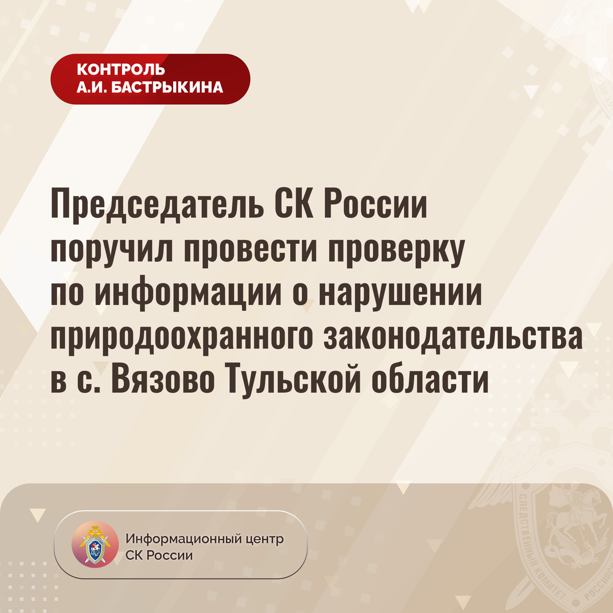 Председатель СК России поручил провести проверку по информации о нарушении природоохранного законодательства в с. Вязово Тульской области Внимание Председателя СК России А.И. Бастрыкина обращено на публикации в сети Интернет о нарушении природоохранного законодательства в селе Вязово Тульской области. Отмечается, что вблизи одного из детских оздоровительных лагерей организованы многочисленные стихийные свалки твердых бытовых и строительных отходов, что оказывает негативное влияние на санитарно-эпидемиологическую обстановку и здоровье несовершеннолетних. Несмотря на имеющиеся нарушения, мер к разрешению проблемы не принимается. Председатель Следственного комитета Российской Федерации Александр Иванович Бастрыкин поручил руководителю СУ СК России по Тульской области Владимиру Владимировичу Усову провести процессуальную проверку и представить доклад об установленных в ходе первоначальных проверочных мероприятий обстоятельствах, а по завершении проверки – о ее результатах. Исполнение пору