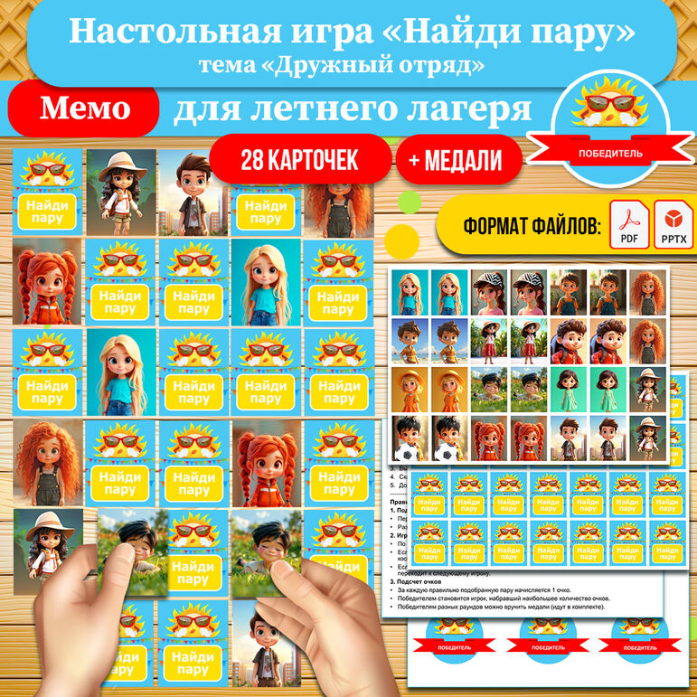 Настольная игра «Найди пару» (Мемо «Летний лагерь», «Дружный отряд») – прекрасный вариант досуга для детей в летнем лагере. Материал состоит из четырёх листов формата А4: 1 лист занимают карточки с изображениями отряда - девочек и мальчиков, 2 лист занимает фон (рубашки карточек), 3 лист – инструкция по подготовке к игре и правила игры, 4 лист – медали победителям раундов. Материал доступен для скачивания в PDF-формате и PPTX-формате (редактируемый).