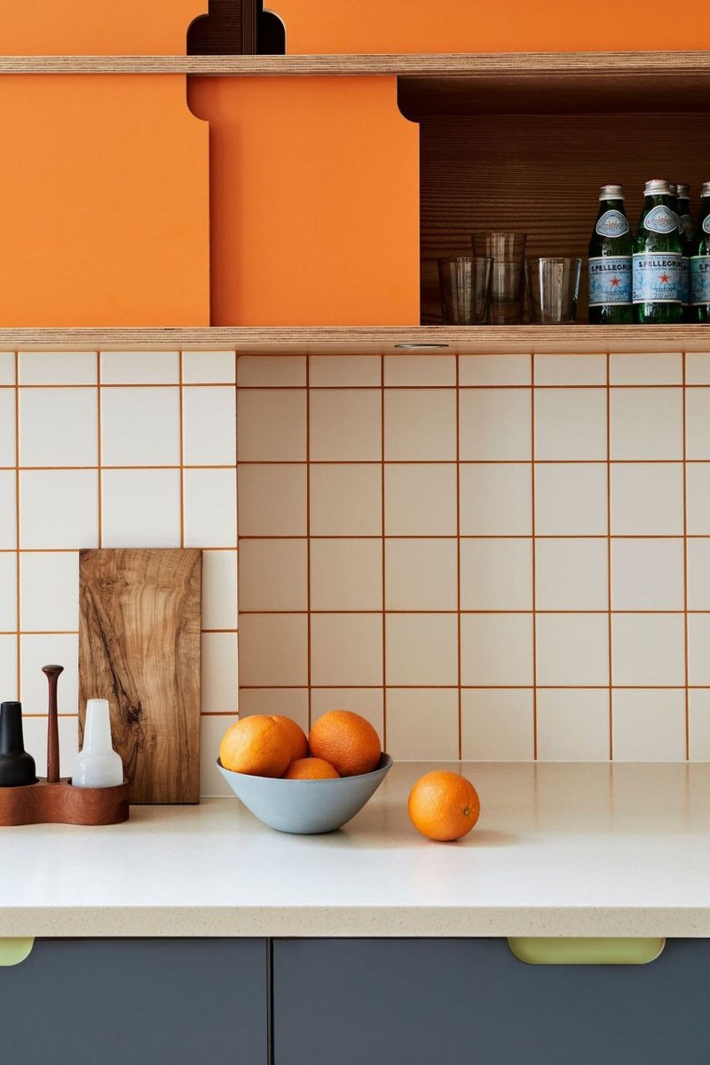 Разноцветные стыки на белой поверхности плитки задают стиль и создают хорошее настроение.