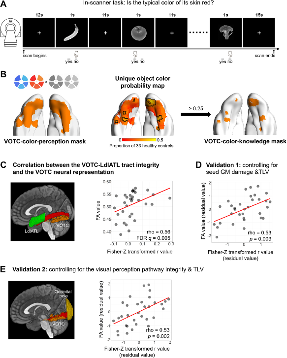 Международная группа нейроученых провела комплексное исследование, изучая то, как взаимодействие между зрительной корой и языковыми центрами мозга влияет на обработку знаний о цвете объектов. В работе, опубликованной в журнале PLOS Biology, использовались методы диффузионной МРТ, функциональной МРТ и нейропсихологического тестирования у 33 пациентов с инсультом и 35 здоровых людей. На рисунке показана связь между целостностью проводящих путей белого вещества в зоне VOTC и нейронной активностью, связанной с распознаванием цвета объектов, включая схему эксперимента, карты активации и статистический анализ. Credit: Bo Liu et al. / PLOS Biology 2025 Основное внимание исследователи сосредоточили на вентральной затылочно-височной коре (VOTC) – области, традиционно связанной с обработкой зрительной информации о цвете. Для точного определения зон интереса исследователи сначала провели эксперимент с фМРТ-сканированием 35 здоровых участников, в котором испытуемые определяли, можно ли считать кра