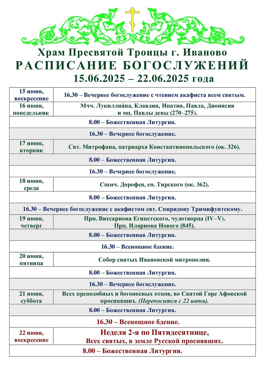 15-22.06. Расписание богослужений в Троицком храме г. Иваново