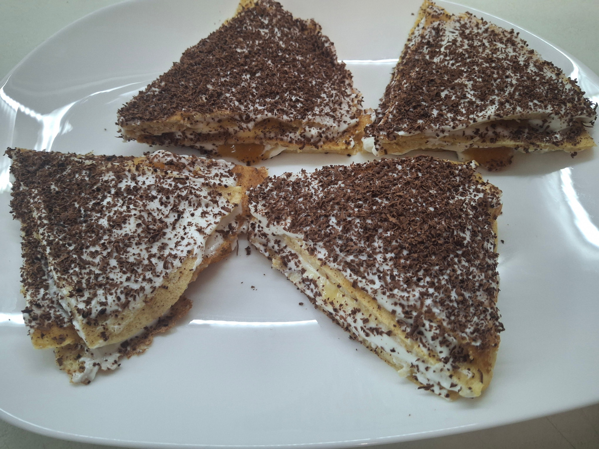 Состав: Приготовление: Взбиваем яйцо с кефиром. Добавляем кукурузную муку и овсянку. Взбиваем погружным блендером и даём постоять минут 20. Жарим два блина. Разогретую сковороду сбрызгиваем маслом и выливаем половину теста, наклоняем сковороду по кругу, так же как при жарке блинов, что бы тесто растеклось по всей сковороде. Закрываем крышкой и жарим на медленном огне минуты 2-3. Затем переворачиваем И жарим аналогично второй блин. Готовые блины разрезаем на 6 частей. Получилось 12 «треугольников». Делаем начинку. Мягкий творог смешиваем с сахарной пудрой. Можно и сахар, но пудра быстрее растворится. Собираем пирожное. На треугольник по краю выкладываем творог, а в середину варенье. Накрываем вторым треугольником и так же смазываем. Выкладываем последний третий треугольник и смазываем его веси творогом. Так же собираем ещё три штуки. Выкладываем на тарелку. Я натёрла шоколад. Можно посыпать порошком какао. Готово. Приятного аппетита!!!