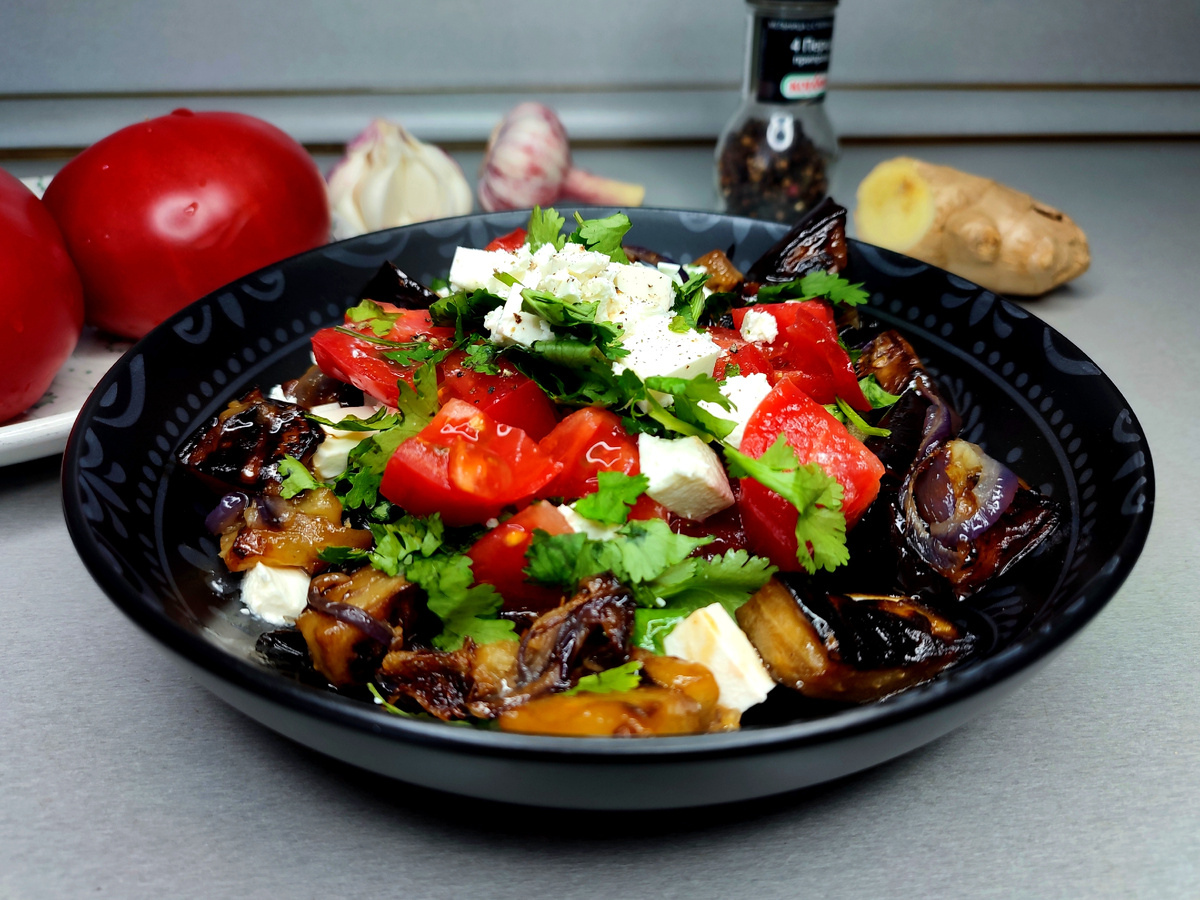 Можно съесть теплым, а можно стрескать и холодным. Лет 5 назад я открыла для себя баклажаны. Дома было не принято их готовить , поэтому жизнь без баклажана была нормой для меня, но неожиданно оказалось что мне и мужу он по вкусу! Чаще всего готовим салаты и фаршированные баклажаны, рулетики хороши, но долго делать. А это смешное название «синенькие» в нашей семье так и не прижилось) это что-то южное, верно? Салат с восточным соусом Терияки и имбирем только кажется трудозатратным, на самом деле все просто и довольно быстро. ▪️Баклажан 1шт ▪️Помидор 2шт ▪️Лук красный 1 шт ▪️Брынза 100гр ▪️Имбирь 10гр ▪️Чеснок 2 зубчика ▪️Кинза 5-6 веточек ▪️Соус Терияки 2 ст.л. ▪️Масло растительное для жарки ▪️Соль, перец ✔️Баклажан нарезать кубиками (2х2 примерно), обжарить на растительном масле партиями, выложить в миску и накрыть, чтобы не остыл. ✔️Красный лук нарезать перьями , натереть чеснок и имбирь на мелкой терке. ✔️Все вместе обжарить до мягкости лука. Переложить к баклажану. ✔️Добавить тери