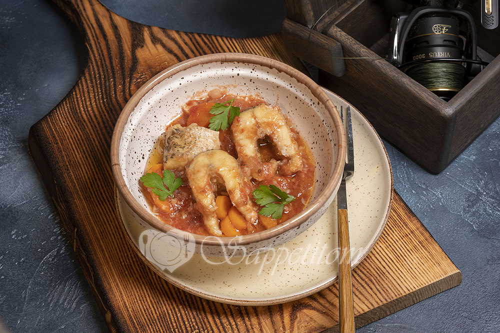 Сегодня будем готовить Судака в томатно-овощной заливке! Это просто пальчики оближешь – можно съесть пару порций и еще добавки попросить. Я серьезно! Нежное и ароматное мясо рыбы в томатном соусе с овощами – и никакого гарнира не нужно (ну разве что свежий салатик). Этот недорогой рецепт второго блюда из рыбы можно даже переделать под себя – возьмите практически любую рыбу с белым мясом (щука, хек, пангасиус, треска, палтус, морской язык). Количество овощей также определяйте по своему желанию. Томатный сок я использую домашнего приготовления, но можно его заменить свежими или консервированными в собственном соку помидорами или летними замороженными, при приготовлении немного подсластив их сахаром. Рыба в томате, приготовленная по этому рецепту – это одно из моих самых любимых блюд. Припущенное или тушеное нежное белое мясо судака хорошо сочетается с кисло-сладким томатным соусом. Явным достоинством рыбы, приготовленной таким способом, является и то, что кусочки остаются совершенно целы