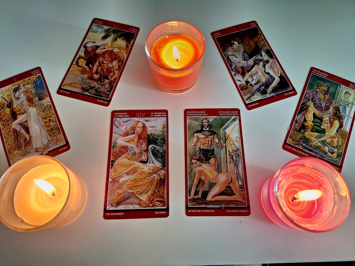 Вот какие арканы легли сегодня на гладь моего стола, чтобы поведать нам его тайны: Тройка Жезлов, Сила, Умеренность, Рыцарь Мечей, Двойка Мечей, Король Мечей.