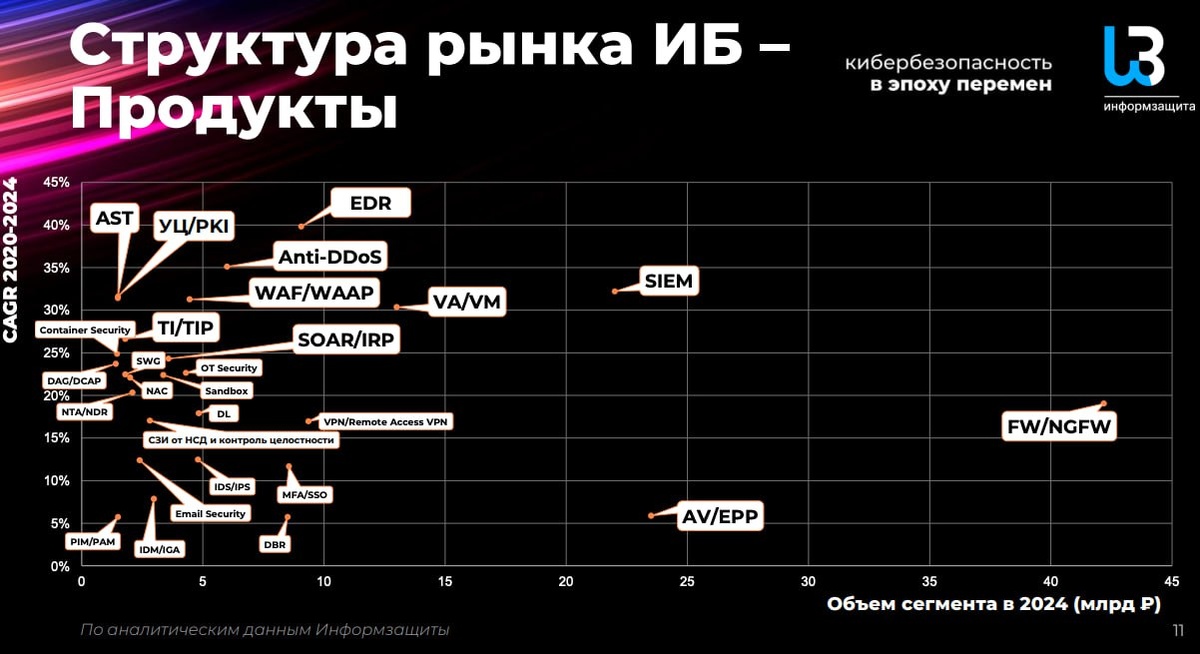 ⭐️ Рынок ИБ-2024: межсетевые экраны, антивирусы и SIEM лидируют с огромным отрывом Вячеслав Максимов, технический директор компании Информзащита поделился отличным исследованием рынка ИБ за 2024 год. 🏷 В топе: межсетевые экраны, AV/EPP и SIEM с огромным отрывом от остальных классов продуктов. DL на картинке видимо DLP - там 4.3 миллиарда в 2024 году. Очень интересно что за продукты включили в DBR. Не нашел Deception и Breach Detection. Деление продуктов на категории интересно посмотреть тут. Импортозамещение особенно актуально в направлениях, где требуется обработка больших объемов данных и трафика: 😶1️⃣ Кластерные МЭ уровня ядра сети с общей пропускной способностью свыше 500 Гб/с 😶2️⃣ Системы защиты от DDoS-атак высокой интенсивности с пропускной способностью от 1 Тб/с и выше. 😶3️⃣ Высокопроизводительные средства анализа исходного кода под множество языков программирования с нативной интеграцией в конвейер DevSecOps 😶4️⃣ Горизонтально масштабируемые WAF-решения для защиты веб