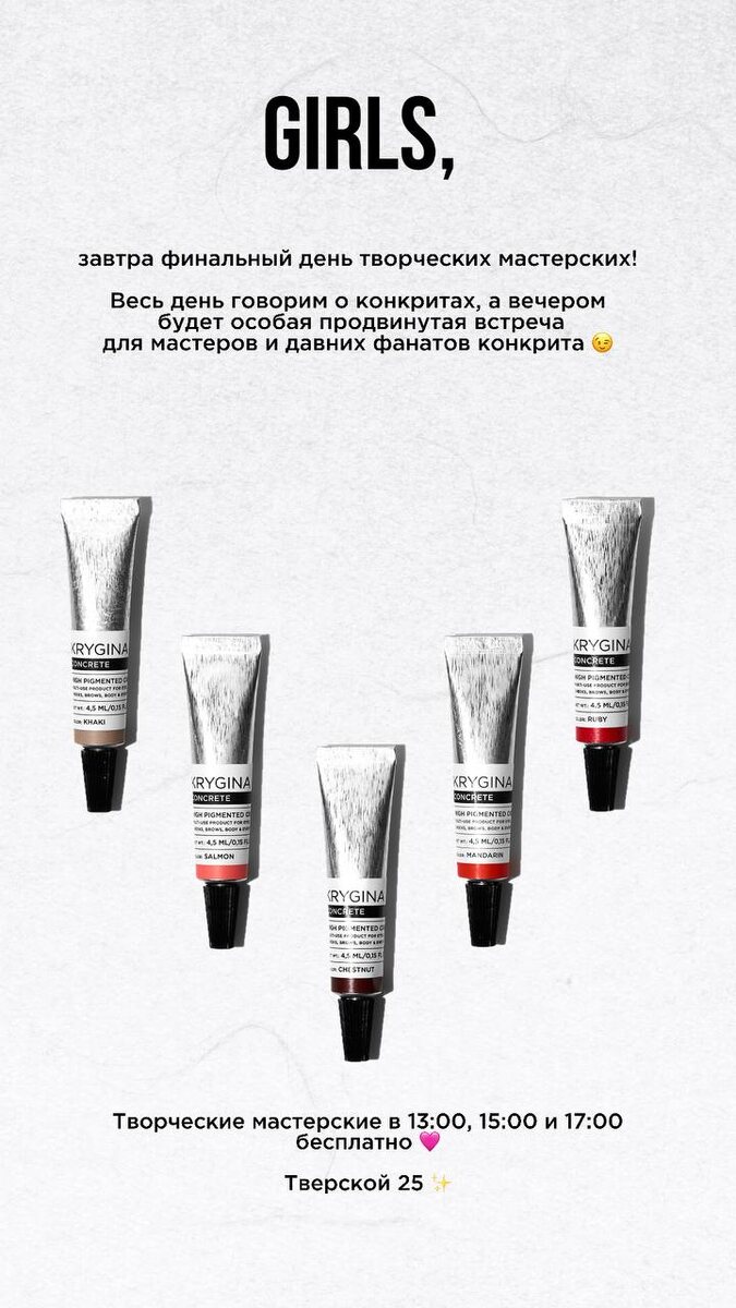 Girls, доброе субботнее утро 🩷 Сегодня ждем вас в 13:00 и 15:00 на Творческих Мастерских, посвященных конкритам. Познакомимся с нашим бестселлером, узнаем все о его использовании 🛍☀️ А в 17:00 будет особая, продвинутая сессия – расскажем особые лайфхаки про использование конкритов. Ждем визажистов и продвинутых пользователей макияжа, давних поклонников конкритов – будет круто!❤️📕🍷 P.S. это последний день Творческих Мастерских, советуем поторопиться 😉