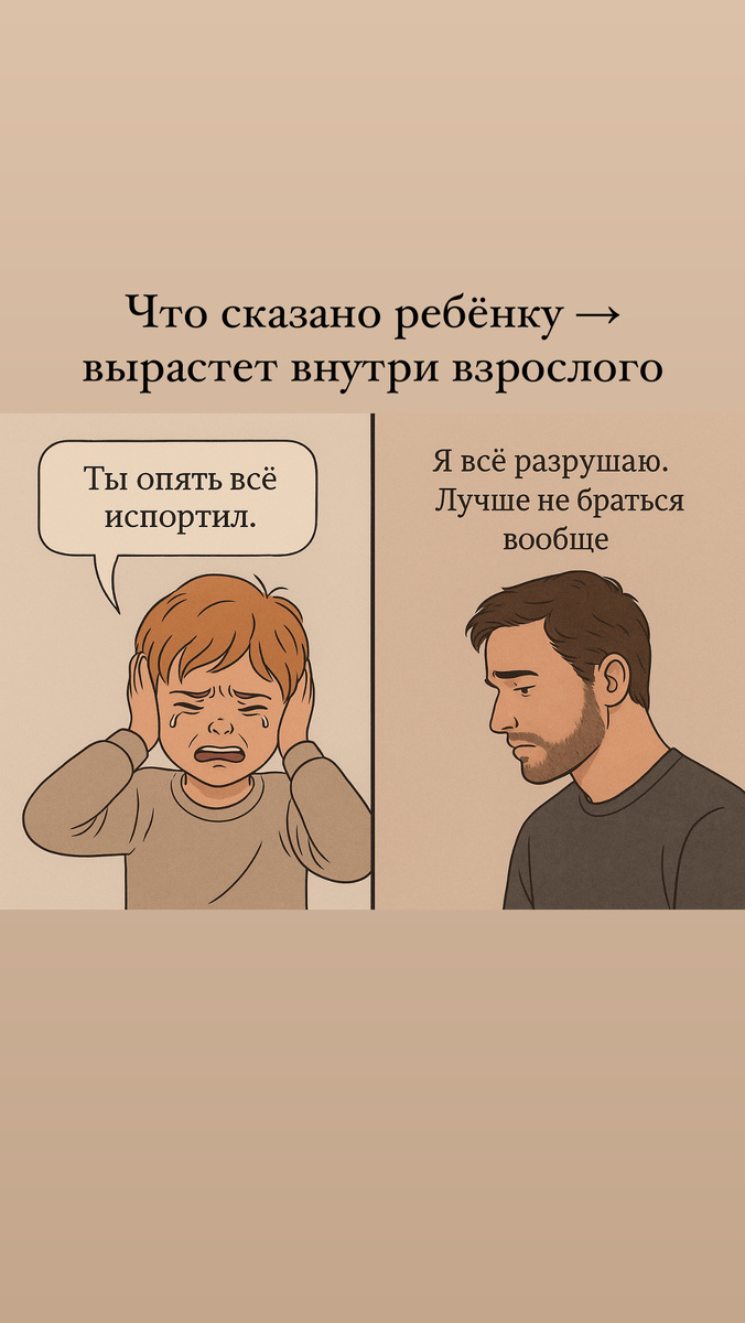 Про то, как сказанное мимоходом может остаться надолго. И как мы до сих пор несём в себе то, что когда-то услышали впервые. 🔹 Фраза: «Много хочешь - мало получишь.» 🧸Отклик внутри: Желать - плохо. Лучше хотеть про себя, незаметно. 🔹 Фраза: «В кого ты такой?» 🧸Отклик внутри: Со мной что-то не так. Я не такой, каким должен быть. 🔹 Фраза: «Молчи, когда взрослые разговаривают.» 🧸Отклик внутри: Мой голос лишний. Меня слышат, только если я не мешаю. 🔹 Фраза: «Что ты плачешь - ерунда же.» 🧸Отклик внутри: Моя боль неважна. Лучше сдержаться, чем быть осмеянным. 🔹 Фраза: «Сейчас дядя тебя заберёт.» 🧸Отклик внутри: Если я неудобный - меня отдадут. Я не в безопасности. 🔹 Фраза: «Посмотри, какой Вася молодец - не то что ты.» 🧸Отклик внутри: Я хуже других. Чтобы меня приняли - надо быть «лучше». 🔹 Фраза: «Тебе ещё рано это понимать.» 🧸Отклик внутри: Я глупый. Мне нельзя знать, думать, спрашивать. 🔹 Фраза: «Будешь плохо себя вести - уйду и не вернусь.» 🧸Отклик внутри: Любовь -
