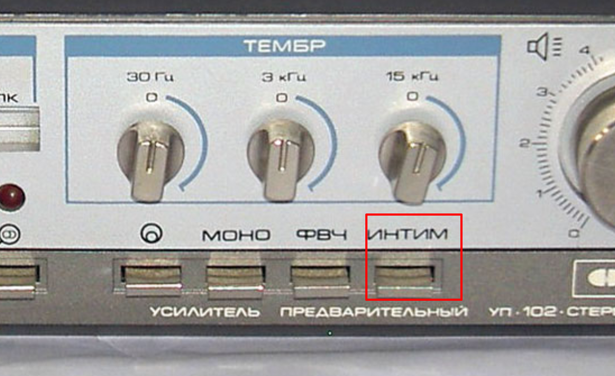 В советской радиотехнике 1960-1980-х годов существовала любопытная особенность - кнопка «Интим», встречавшаяся на популярных усилителях вроде «Ода УП-102С», «Вега-109» или «Радиотехника УП-001». В последних двух кнопка позже была заменена на «Ослабл» и «Тихо». Вопреки возможным ассоциациям, это решение имело сугубо практическое назначение. Активация данной функции приводила к комплексному изменению звукового сигнала: снижению громкости примерно на 20-22 децибела и одновременной коррекции частотной характеристики с акцентом на подавление средних частот. Такой подход позволял сохранить разборчивость речи при фоновом музыкальном сопровождении, создавая комфортные условия для общения.