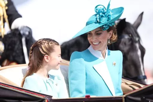 Платье такого же цвета надела принцесса Шарлотта. Мать и дочь улыбались приветствующим их поклонникам и махали руками из кареты, в которой Кейт поедет вместе с детьми, а Уильям будет участвовать в параде верхом на лошади.