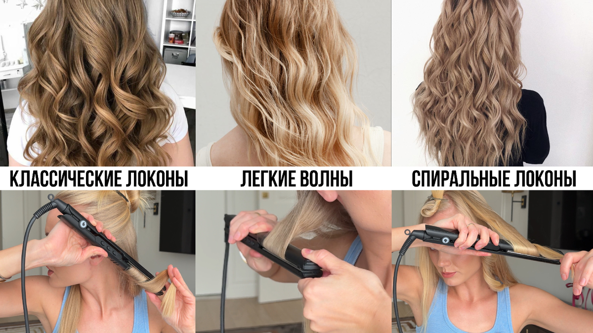 Теперь переходим к техникам. Покажу три вида укладки: классические локоны, легкие волны, спиралевидные локоны.