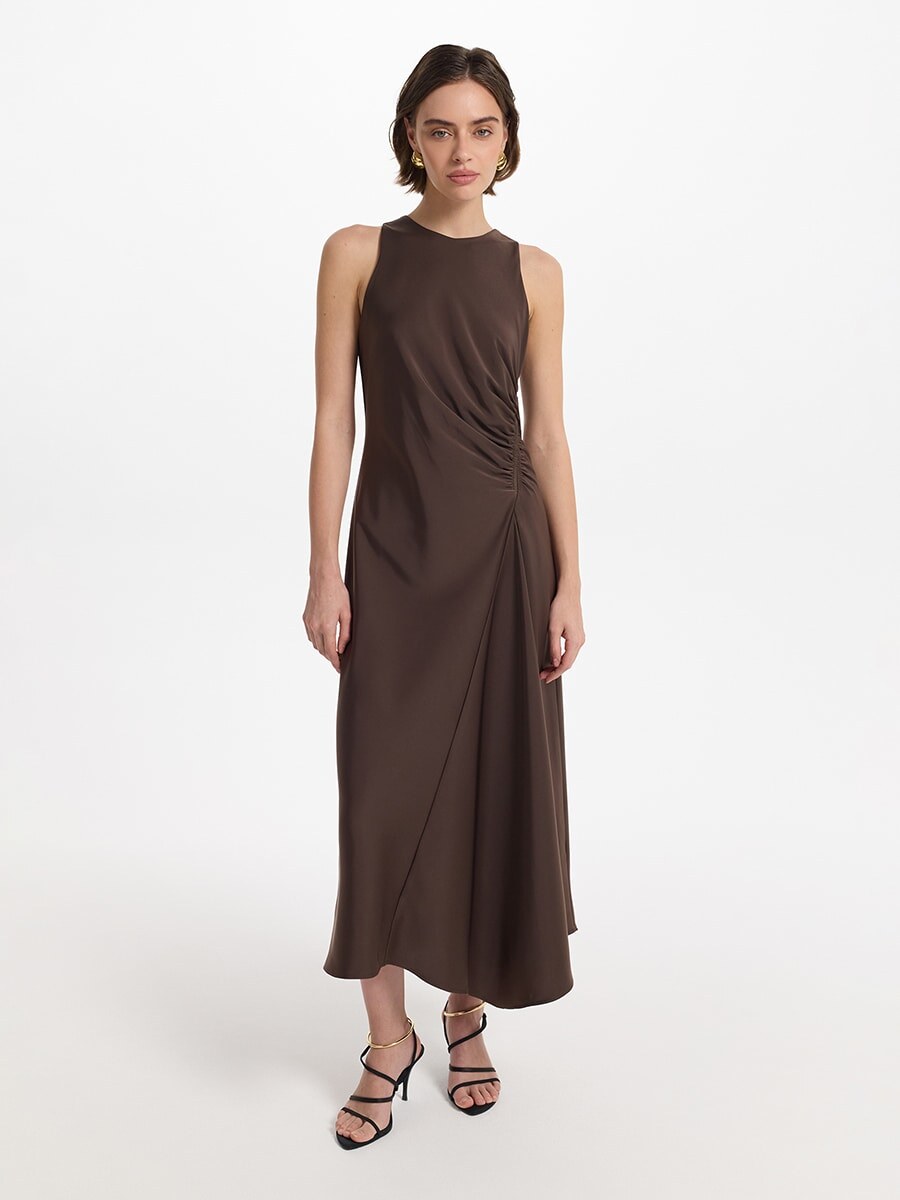 Этот стиль особенно выигрышно смотрится в нейтральных оттенках — от сливочного масла до благородного коричневого. Плотная ткань с эластаном обеспечивает комфорт на протяжении всего вечера.
