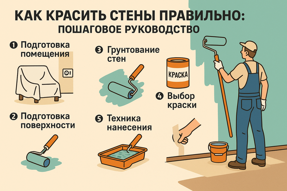 Как красить стены правильно: пошаговое руководство для идеального результата Покраска стен — один из самых популярных и доступных способов обновить интерьер. Однако, несмотря на кажущуюся простоту, результат часто разочаровывает: появляются разводы, неровности, краска отслаивается. Чтобы этого не произошло, важно не только выбрать качественные материалы, но и соблюдать технологию нанесения. В этой статье расскажем, как красить стены правильно — пошагово, с практическими советами и тонкостями, которые знают только опытные маляры. Прежде чем брать в руки кисточку или валик, подготовьте комнату: Важно! Температура в помещении при покраске должна быть в пределах +18...+25°C. При слишком низких температурах краска будет плохо ложиться, а при высоких — быстро высыхать и тянуться полосами. От состояния стен зависит, насколько ровно и качественно ляжет краска. Выполните следующие действия: Этот этап часто пропускают, а зря. Грунтовка: Выбирайте глубокопроникающую акриловую грунтовку, особе
