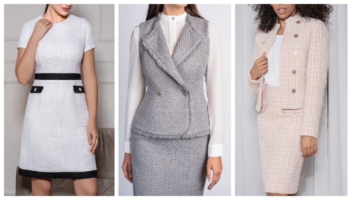 Коко Шанель — воплощение элегантности и стиля, чья индивидуальность вдохновляет дизайнеров и сегодня. Пристальный взгляд на её образы пробуждает у стилистов стремление создавать уникальные и изысканные ансамбли. И вот перед вами открывается изумительная галерея обворожительных нарядов, вдохновлённых творчеством легендарной Коко Шанель. Твид занимал особое место в созданиях мадам Шанель. Позвольте представить вам первый яркий образ из нашей коллекции: твидовый костюм оттенка нюд с мини-юбкой, дополненный шёлковой майкой золотого оттенка и туфлями на высоком каблуке. Еще один пример изысканного образа состоит из твидового платья пудрового оттенка с акцентными карманами и стеганой каркасной сумки бежевого цвета. В гардеробе у знаменитой модницы всегда было много шикарных твидовых платьев нежных оттенков, которые она носила с обувью на каблуке и минималистичными моделями клатчей. Весьма необычный образ на этот раз получился благодаря твидовому костюму с жилетом и миди юбкой, а также белосн