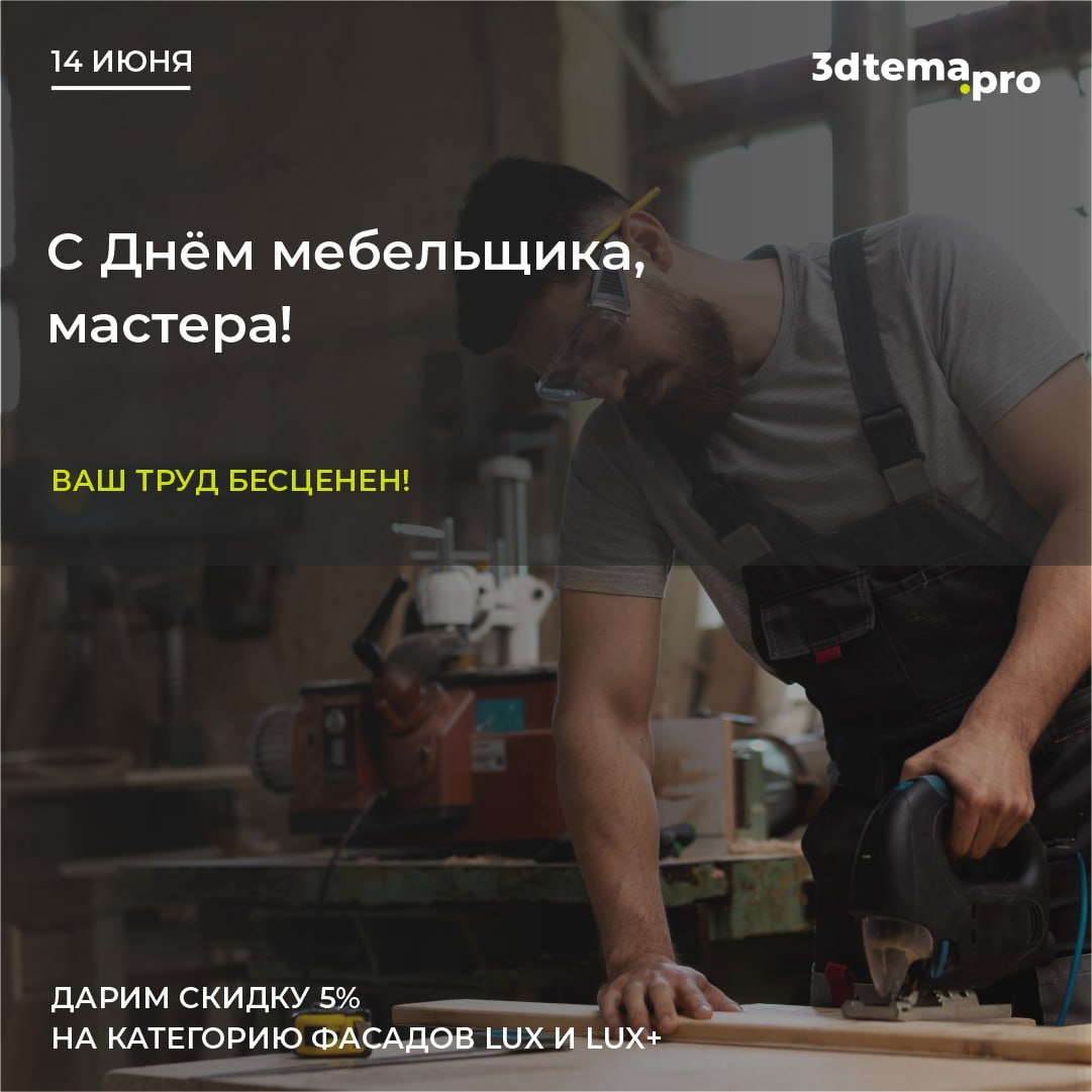 Друзья, профессионалы! Сердечно поздравляем вас с Днём мебельщика – профессиональным праздником всех, кто создаёт уют, вдохновение и комфорт в каждом доме! 🥳🥳🥳 Для нас этот день особенный, ведь уже много лет мы вместе с вами превращаем обычные помещения в пространства мечты. Каждый шкаф, кухонный гарнитур или гостиная – это не просто мебель, а частичка души наших мастеров, дизайнеров и технологов. В честь праздника приготовили для вас особенный подарок – скидку 5% на фасады категории LUX и LUX+! Стоимость фасадов LUX по акции: В матовой эмали - от 13 657 руб./кв.м; В глянцевой эмали - от 16 389 руб./кв.м. Стоимость фасадов LUX+ по акции: В матовой эмали - от 16 362 руб./кв.м; В глянцевой эмали - от 19 094 руб./кв.м. Срок действия акции с 16 по 20 июня. Подробнее тут С праздником! Желаем вам вдохновения, уюта и гармонии в каждом доме. Спасибо, что выбираете нас!