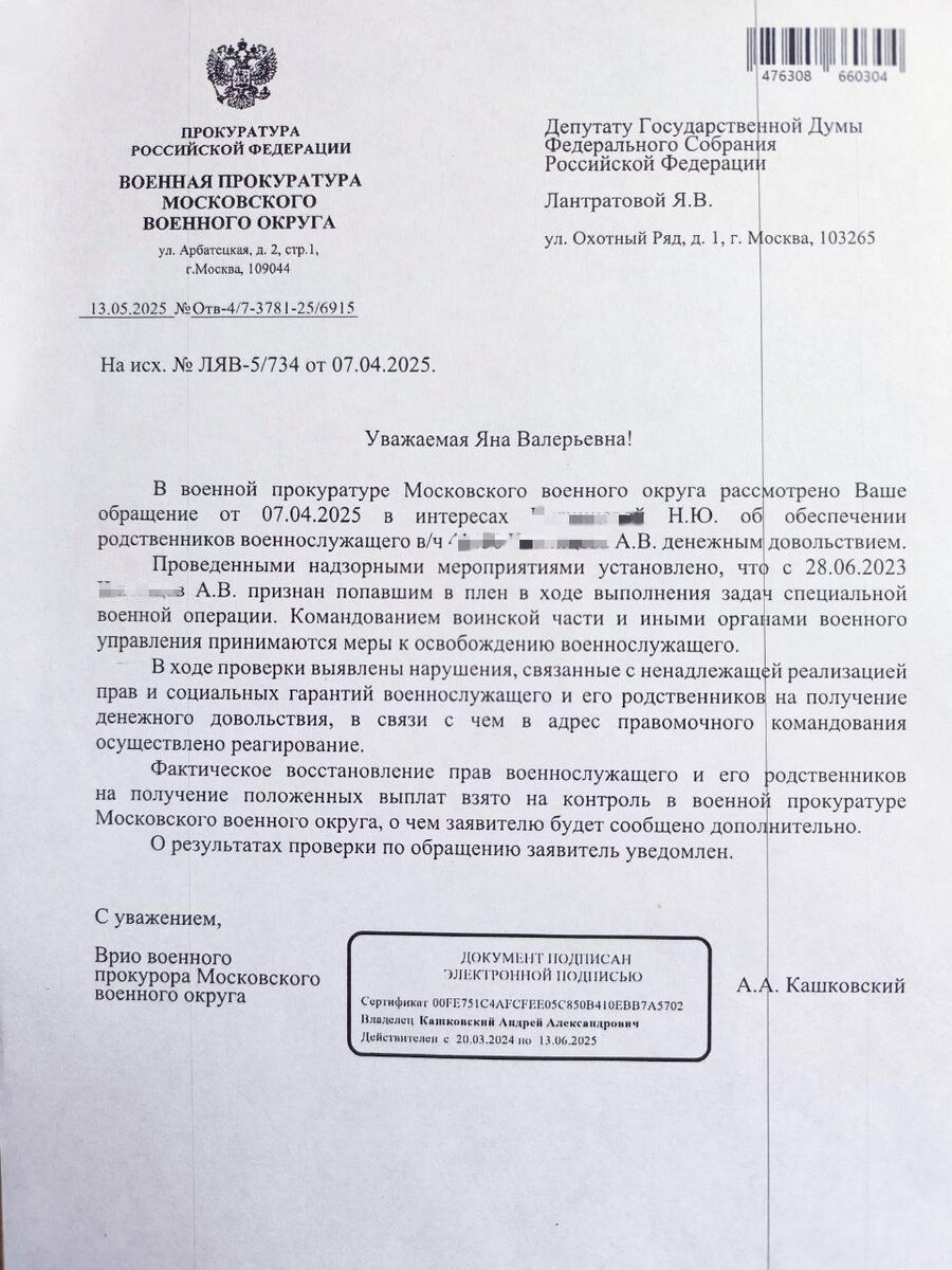 Недавно ко мне обратилась мать военнослужащего, который с июня 2023 года находится в плену, где оказался в ходе выполнения задач специальной военной операции. Несмотря на то, что её сын признан военнопленным, его денежное довольствие продолжало начисляться бывшей супруге, с которой он давно не живёт и не ведёт совместное хозяйство. 🔴Согласно закону, выплаты должны направляться родственникам, проживающим совместно с военнослужащим, или использоваться в интересах его семьи. Однако вместо этого деньги поступали на счёт женщины, которая юридически уже не имеет никакого отношения к военнослужащему. 🔵Я обратилась в Генеральную прокуратуру с просьбой разобраться в этой ситуации. Благодаря проведённым надзорным мероприятиям факт нарушений был подтверждён. Военная прокуратура Московского военного округа внесла представление командованию части о необходимости устранить нарушения. Сейчас ситуация взята под контроль. Хочу поблагодарить военную прокуратуру за оперативность и профессионализм. С