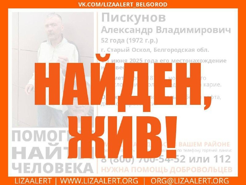 Пропал человек! Пискунов Александр Владимирович, 52 года, г. Старый Оскол. С 1 июня 2025 года его местонахождение неизвестно. Если вы обладаете какой-либо информацией о пропавшем, просьба позвонить по номеру телефона горячей линии отряда 88007005452 (бесплатно по РФ) или 112. ❕ Жесть Белгород - подписаться