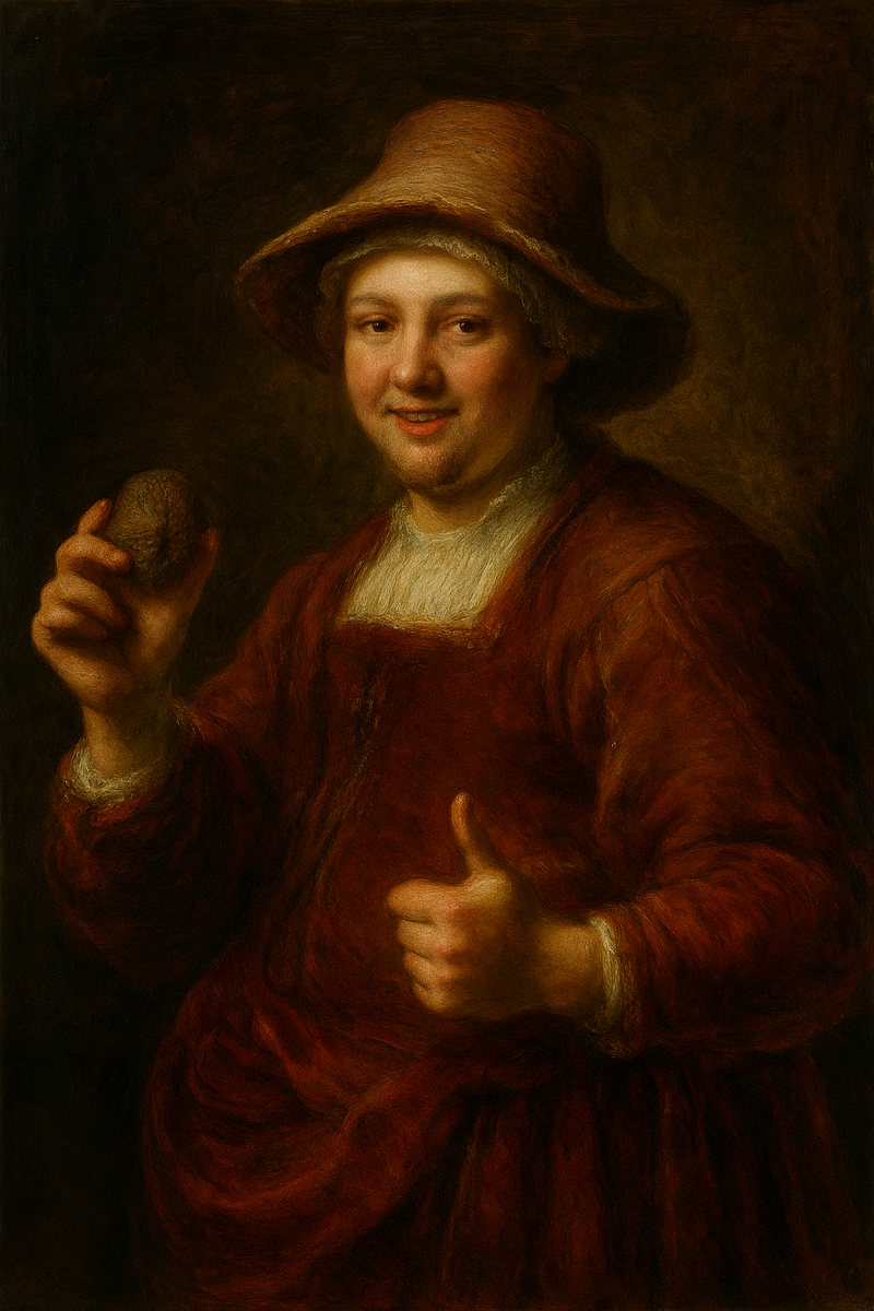Промт: Oil painting in the style of Rembrandt, featuring soft chiaroscuro lighting, textured brushstrokes, rich baroque background elements, and realistic facial expression in 17th-century European portrait tradition. 📜 Средневековье — магия рукописей