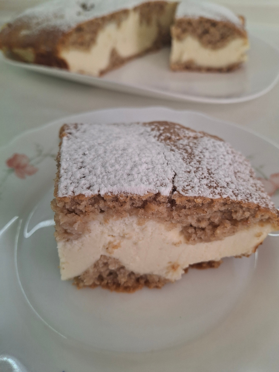 Состав: НАЧИНКА: Приготовление: Овсяные хлопья заливаем тёплым молоком. Даём набухнуть 30 минут. Пока делаем начинку. Пробиваем погружным блендером яйца с творогом, молоком, соль, сахар и ванильный. Затем добавляем крахмал, хорошо размешиваем. Овсянка набухла. Добавляем яйца, сахар, соль, разрыхлитель и масло. Перемешиваем вилкой. Форму выстилаем мокрой бумагой. У меня форма 20*20 см. Выкладываем половину «теста». Разравниваем лопаткой. Выкладываем начинку, разравниваем. Затем выкладываем вторую часть теста, аккуратно, чтобы оно не «утонуло» в начинке. Ставим в разогретую до 180 градусов духовку на 35-40 минут. Достаём. Даём немного остыть. Посыпаем сахарной пудрой. Режем на порции. Приятного аппетита!!!