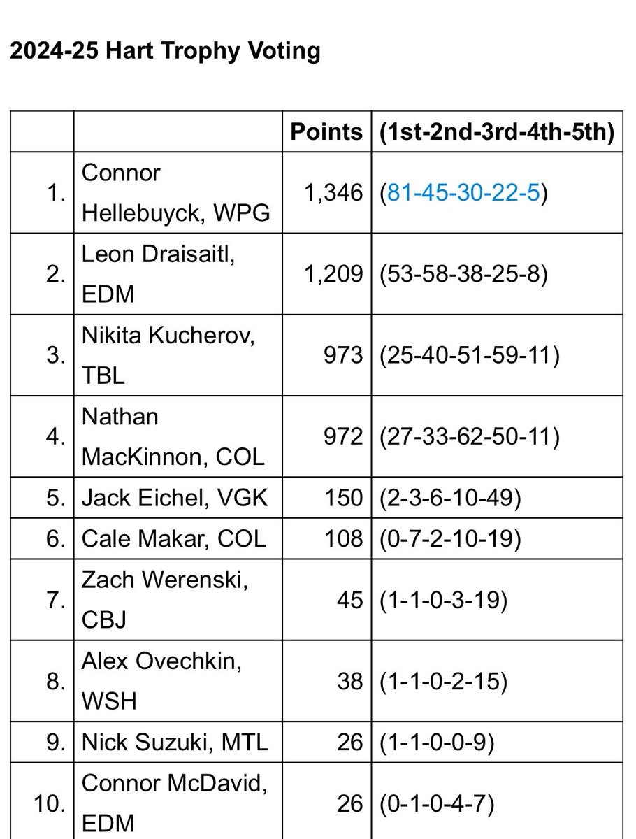 Несмотря на знаменательный сезон, что провел Александр Овечкин, имя российского форварда «Вашингтона» не мелькало в числе главных претендентов на «Харт Трофи», что получает самый ценный игрок регулярного чемпионата. Впрочем, некоторые представители СМИ не забыли о блестящей кампании капитана «столичных»: в голосовании, которое проводится среди членов Ассоциации пишущих хоккейных журналистов, 39-летний нападающий стал 8-м, получив 1 первое место, 1 – второе, 2 – четвертых и еще 15 – пятых. Присутствие Овечкина в топ-10 по итогам голосования за обладателя «Харт Трофи» впечатлило некоторых американских болельщиков, оставлявших свои комментарии в социальной сети X и на ресурсе Reddit. @Mike_OxBig133:– Оказаться выше Макдэвида, когда тебе 39, – это нехилое достижение. Сезон у Ови действительно получился впечатляющим, особенно с учетом того, что он был вынужден пропустить немало игр. @Jaded_Disaster1282:– Всего 8-е место? Я-то думал, что он повыше будет. @daPhuc28:– У меня нет сомнений, что