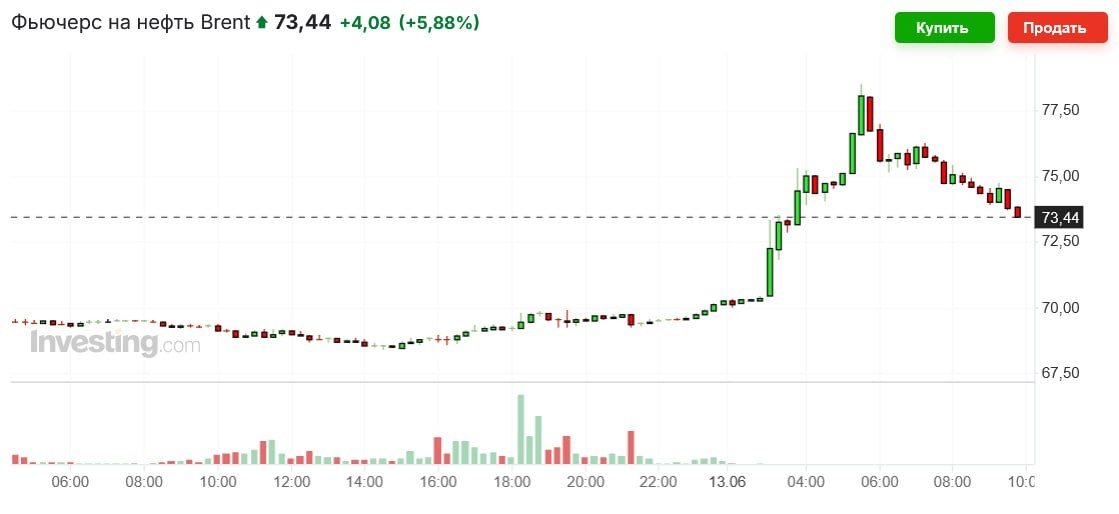 Цены на нефть вчера ночью подскочили в моменте на 10%. Удар Израиля по ядерным объектам Ирана. Похоже, весьма эффективный. Все его ждали, но явно расслабились после мирных призывов Трампа, который выражал надежду на переговоры с Ираном для недопущения его ядерной программы. А может эти призывы были отвлекающим маневром? Трамп заявил, что #США не участвовали в этой акции. Хоть удар не по нефтяным базам, но цены на нефть моментально улетели в облака. Очередное обострение на Ближнем Востоке, которое может развиваться непредсказуемо. Поэтому золото снова растет, а акции в основном падают. Невеселый день. Пятница, 13-е.