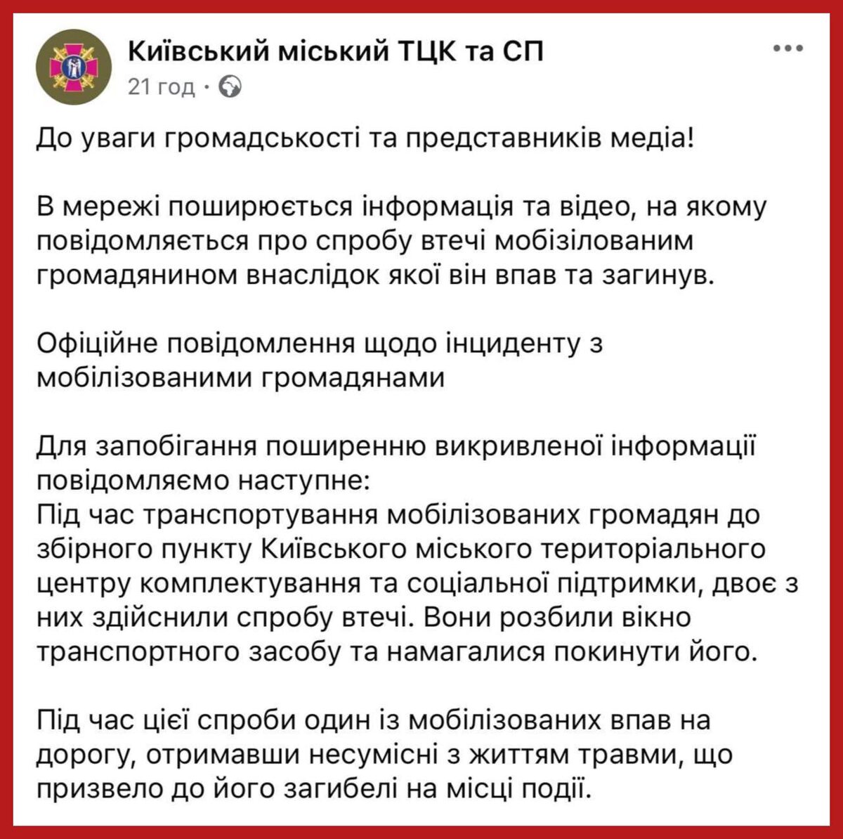 В Киеве один из мобилизованных погиб, выпрыгнув из служебного транспорта по пути в сборный пункт