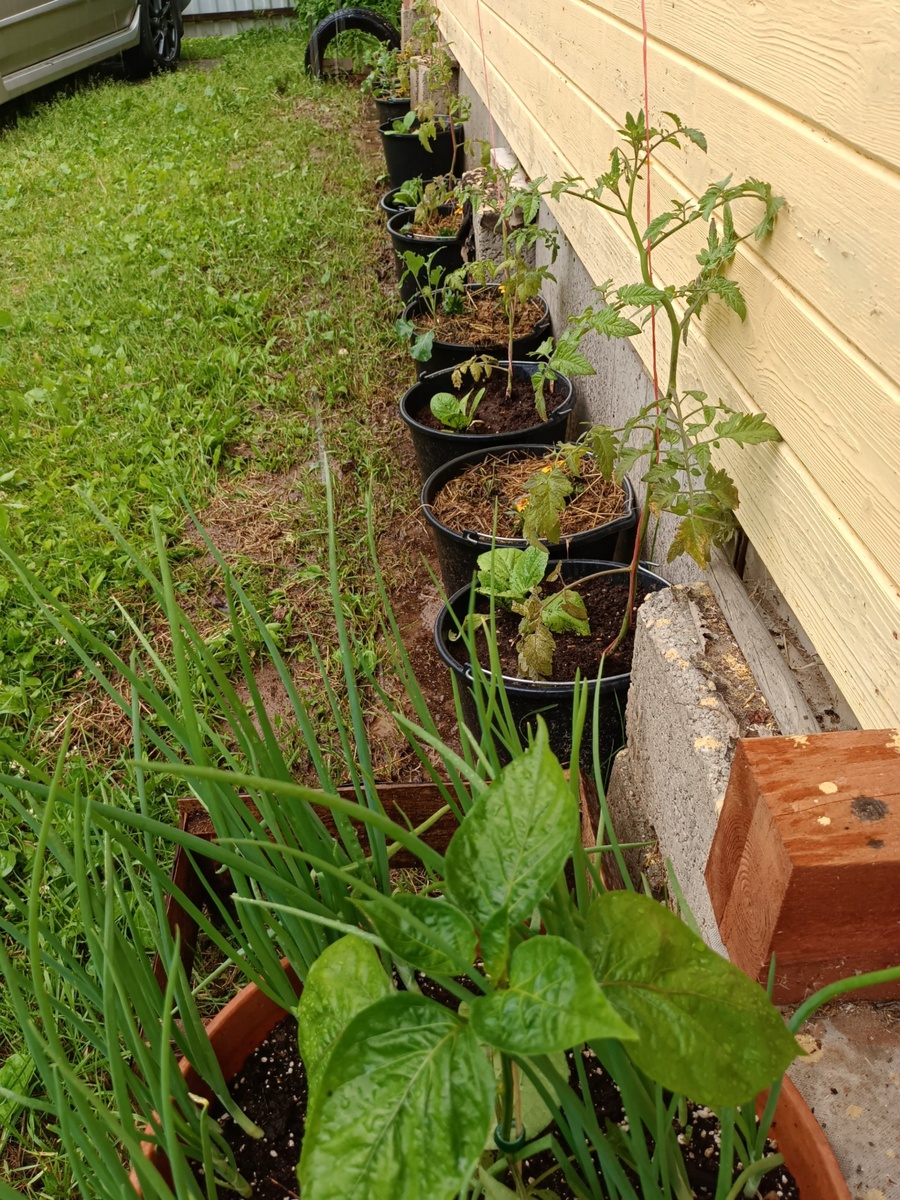 У гаражной зоны, вдоль дома, расставил 12 литровые вёдра-горшки. Тут и бархатцы, и декоративная капуста, и пакчой, и томаты. Ещё пару горшков осталось сюда добавить. Но это уж как погода позволит.